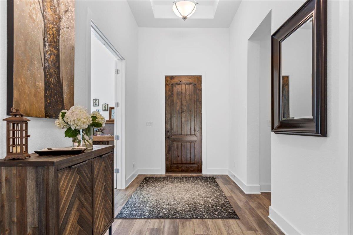 Tucked inside the prestigious boutique community of Breakwater, this stunning single-story estate sits on a full one-acre lot with immaculate landscaping and a custom sparkling pool - no neighbors behind the property -offering the perfect blend of privacy, elegance, and lifestyle. This thoughtfully designed home is filled with high-end upgrades and luxurious finishes throughout. From the moment you enter, you’ll feel the seamless flow of open-concept living, tall ceilings, and expansive windows that invite in natural light. The breakfast room opens to a backyard covered patio with screen and an outdoor kitchen with pool rounds out the private outdoor retreat. The heart of the home is a gourmet kitchen with quartz countertops and custom cabinetry which opens to the living space with a wine storage area, and spacious media room making everyday living both beautiful and functional. The flexible floor plan includes a full mother-in-law suite or game room with wet bar — ideal for guests, entertaining, or multigenerational living. Other upgrades include a mud room, just off of the 3 car garage with epoxy flooring, and a laundry room with coffee bar which is generously sized and stylishly appointed, offering practicality with a designer touch. Located in a unique - yet central pocket of Austin, Breakwater offers a rare combination of tranquility and accessibility—just 30 minutes from the airport and moments away from Austin’s best dining, shopping, parks, and cultural experiences. LENDER PAID 1/0 BUYDOWN! Enjoy reduced monthly payments at the start of the home loan with a Lender Paid Temporary Buydown. Lender Partner to buydown your interest rate by 1% for the first year of your mortgage.