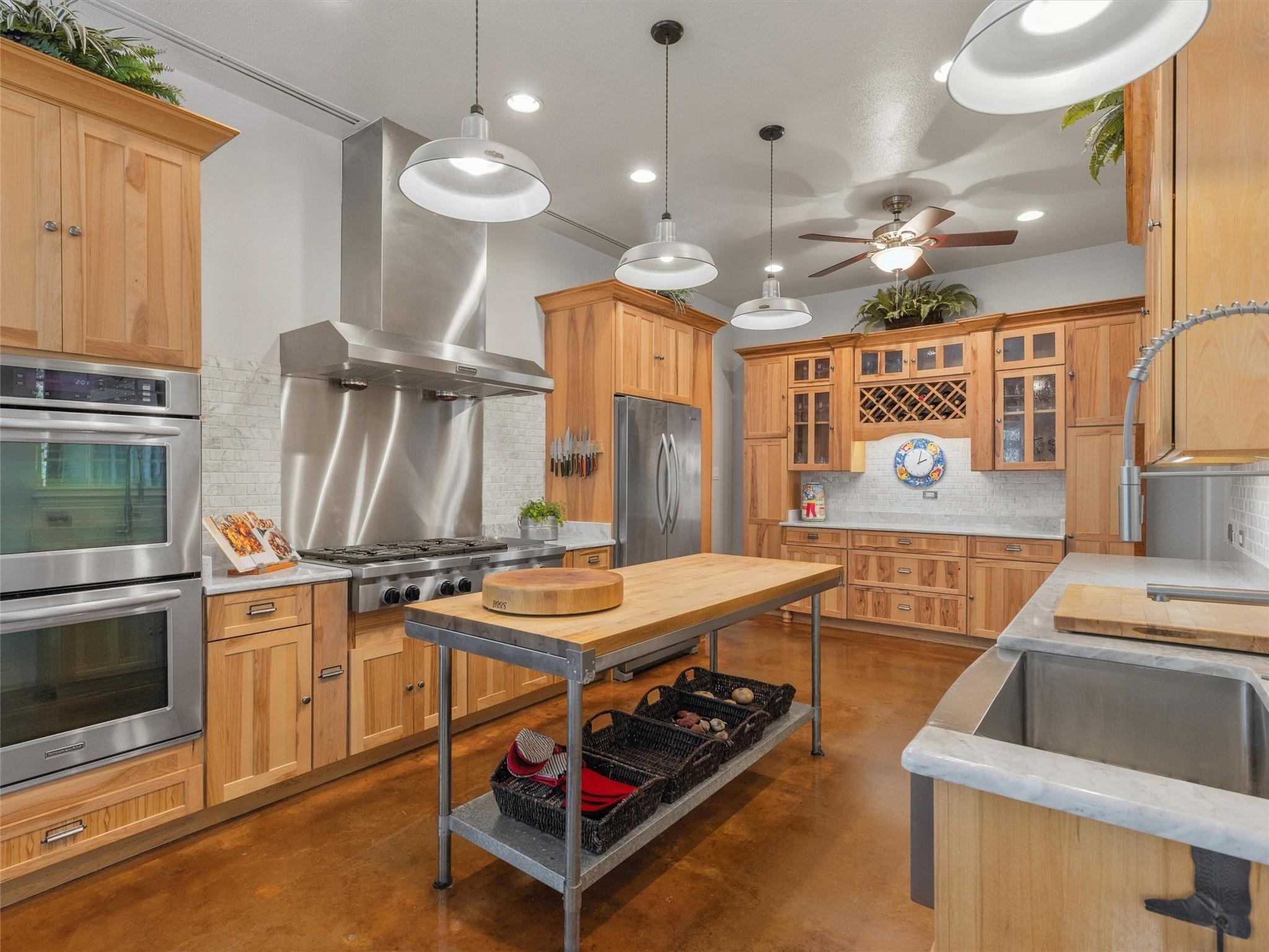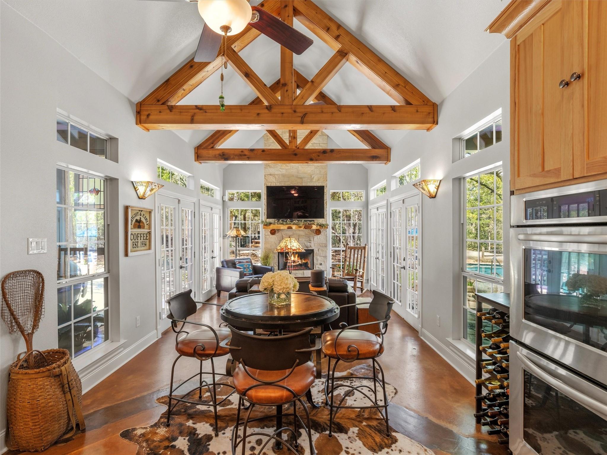 A gorgeous country home set on a beautifully maintained property, where architectural detail and well-planned spaces set it apart. At the center of the home, the kitchen features hickory cabinetry, marble countertops, a butcher block island, and KitchenAid professional series appliances, including a six-burner gas cooktop with griddle and double ovens. Just off the kitchen, an expanded living area includes wood-beamed ceilings, a gas fireplace, and French doors that open to the outdoors, along with access to a screened sun porch. The main living room offers soaring ceilings, built-ins, and a second gas fireplace. The primary suite is designed for comfort, featuring a walk-in steam shower, double vanities, and dual toilets. Above the three-car garage, a detached 548 square foot guest suite offers an additional bedroom, bathroom, living room and office nook with wood and tile flooring. Outdoor living takes center stage, with over 1,400 square feet of well-designed space, exceptional landscaping, and custom hardscape. The covered outdoor kitchen includes a Santa Maria-style Argentine grill, surrounded by detailed stonework that blends naturally into the setting. A separate patio features a built-in wood-burning oven, a fire pit, and a wraparound porch. A sparkling saltwater pool with heater and waterfall is set into the landscape, creating a private setting for relaxing or entertaining, with a pool house that complements the overall design. Throughout the property, details stand out in subtle ways, including petrified wood accents, custom inlays, terraced beds, and repurposed rock columns. The wooded acreage includes established trails and carries a wildlife exemption, supporting reduced property taxes while maintaining the natural setting. Everything about this home and property has been well thought out, well designed, and well cared for, from the interior spaces to the outdoor living areas and trails that run throughout.