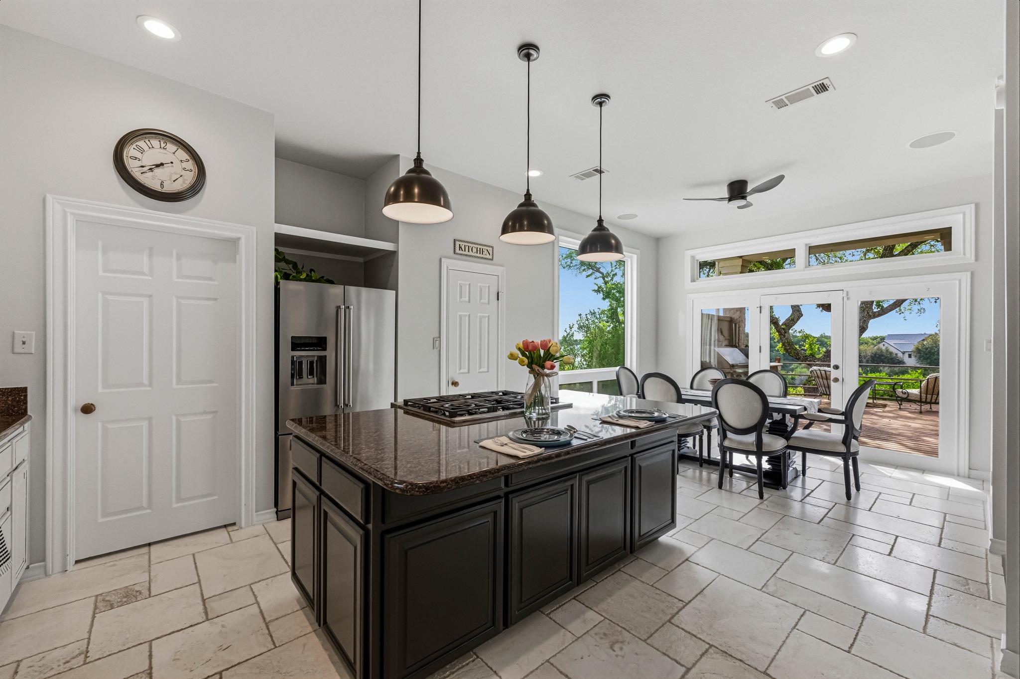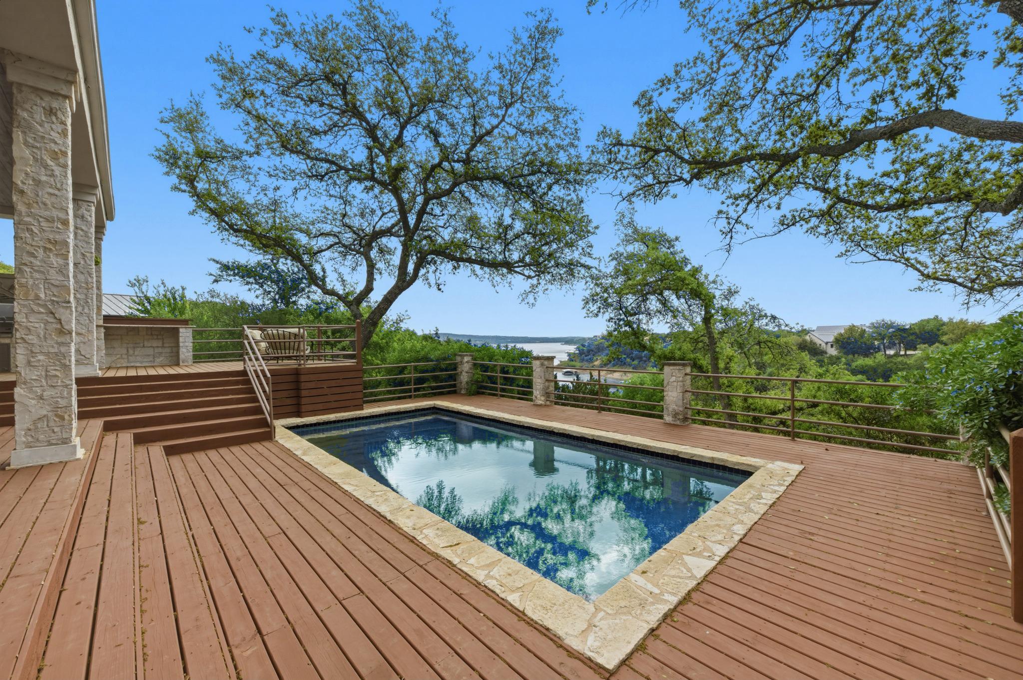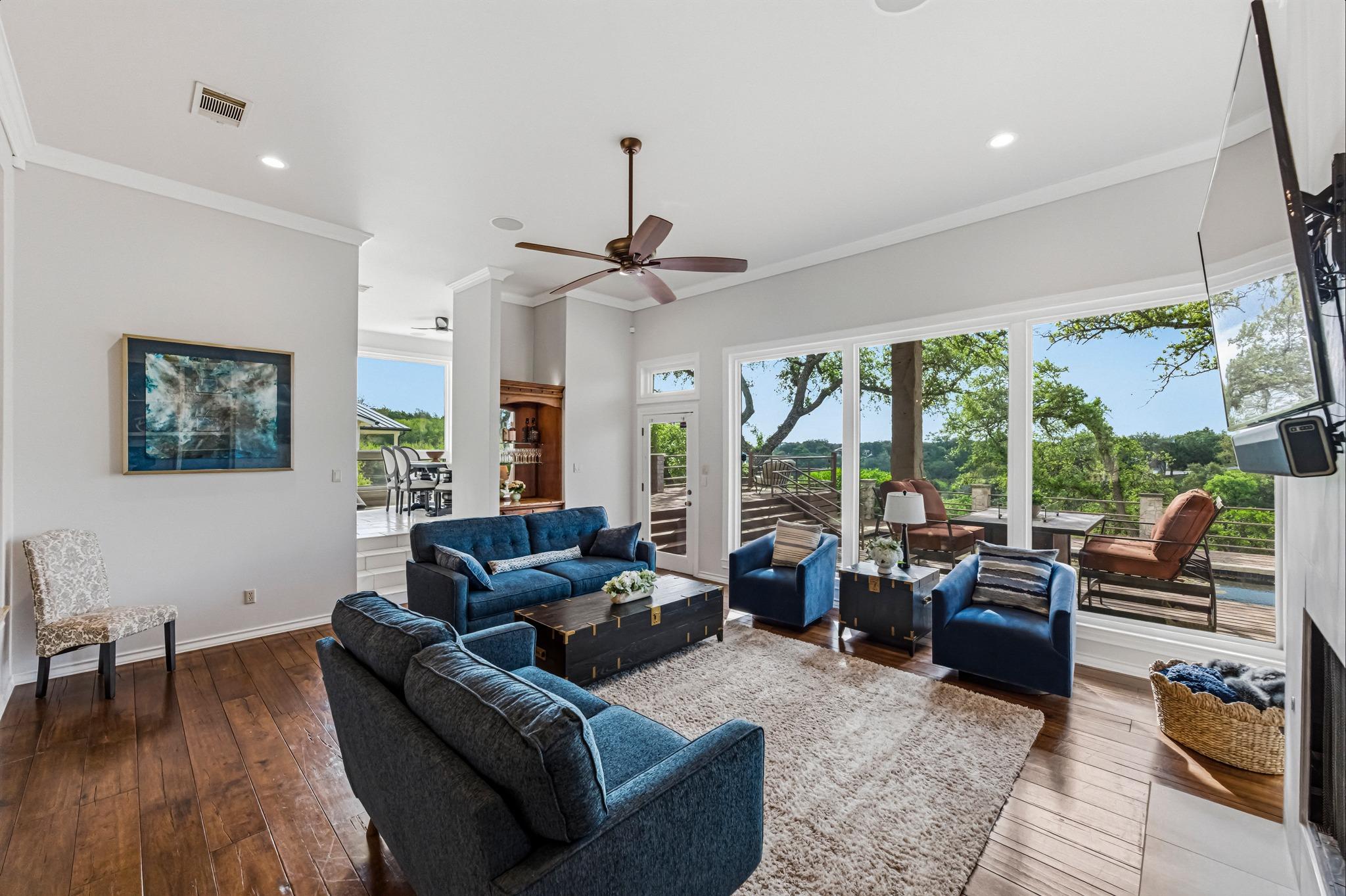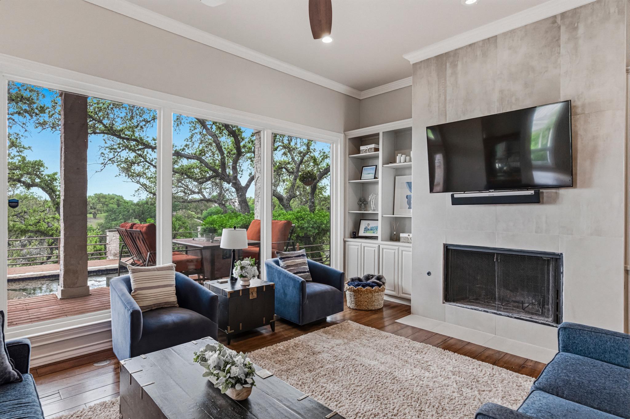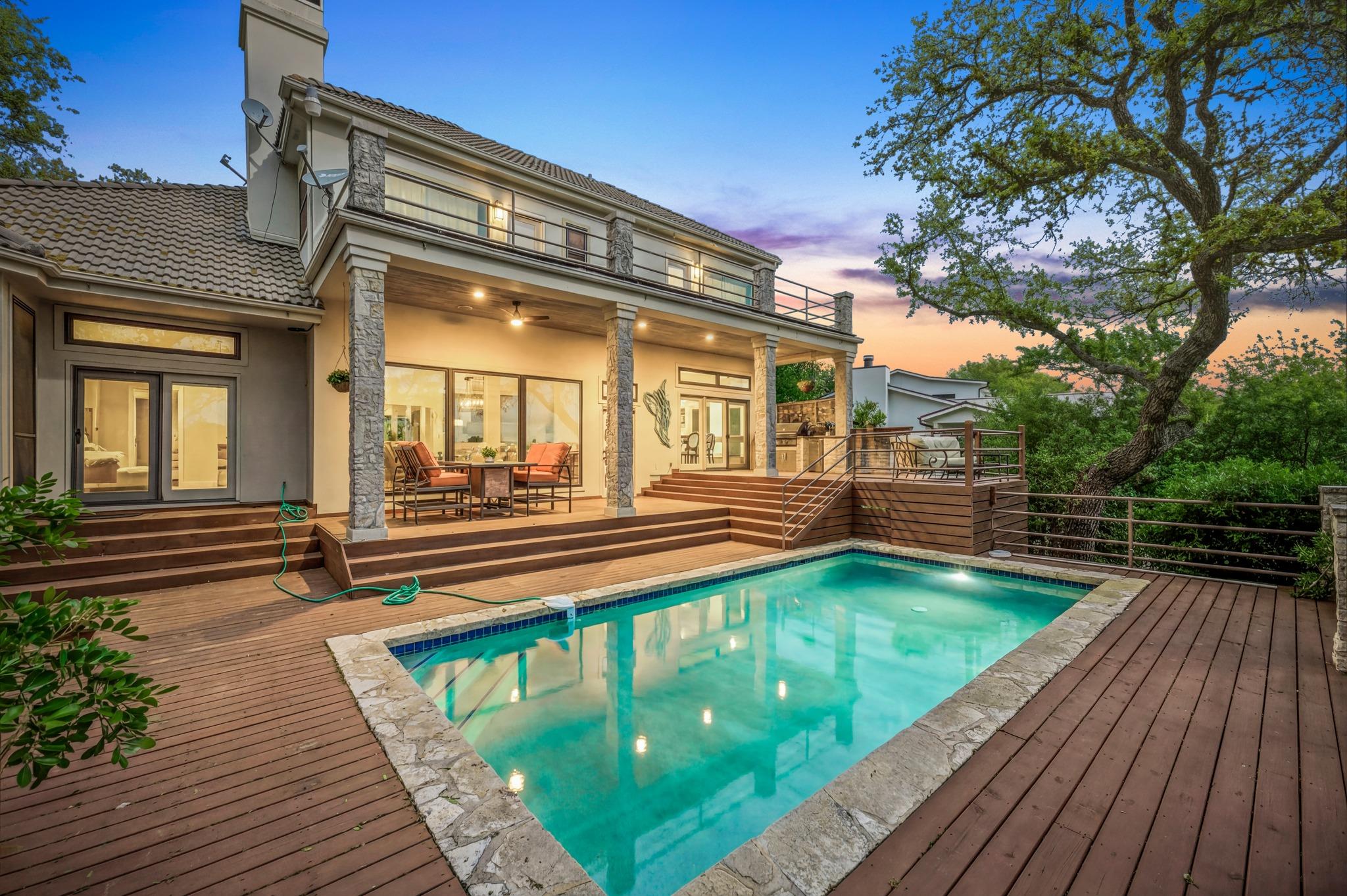 Rare acreage waterfront opportunity in Barton Creek Lakeside, one of the area’s most prestigious golf communities, set on nearly 2 acres and situated in a canopy of mature oak trees in a private, park-like setting. A long driveway leads to the home, offering exceptional privacy and a peaceful retreat. The property slopes down to Lake Travis and features a large, flat front and side yard along with expansive lake views from nearly every room, including all bedrooms. The living room and primary bedroom each feature a fireplace, and the spacious upstairs secondary bedrooms include one with a private sitting area. The primary bathroom features two separate bathrooms and closets. Outdoor living is designed for both relaxation and entertaining, featuring a pool and outdoor kitchen overlooking the lake, as well as multiple patios to take in the stunning views. An amazing waterfall has been built into the side of the hill near one of the patios to complement one's outdoor experience. A flagstone path winds through the beautifully landscaped grounds or take the tram down to the private boathouse and large dock that can accommodate two boats, all set on a quiet, deep cove. Many recent updates include new HVAC units, a whole-house generator, complete remodels of the primary bathrooms, pool plaster refinishing, new Trex decking on the upper patio, replacement of all ceiling fans, upgraded fireplace surrounds, and new chandeliers in the primary bedroom. Located within a 24-hour manned gated community featuring an 18-hole Arnold Palmer golf course, tennis courts, marina, fitness center, pool, and clubhouse, and a low tax rate of 1.55%.