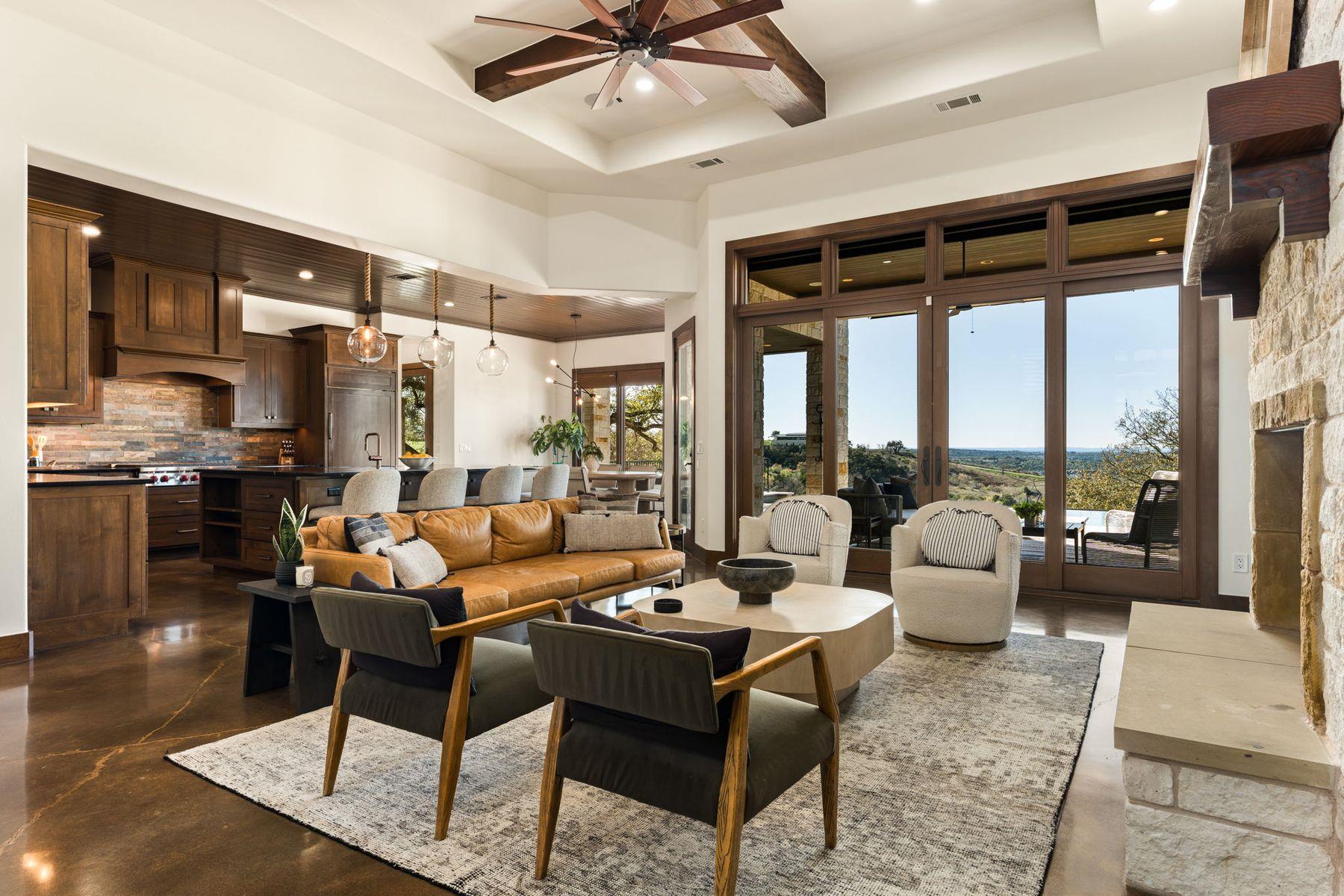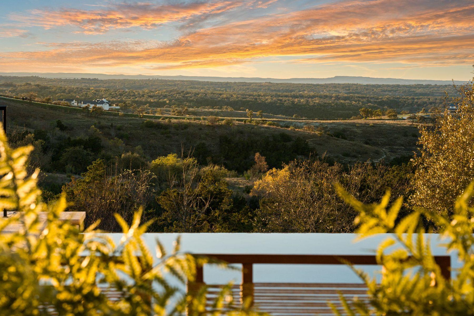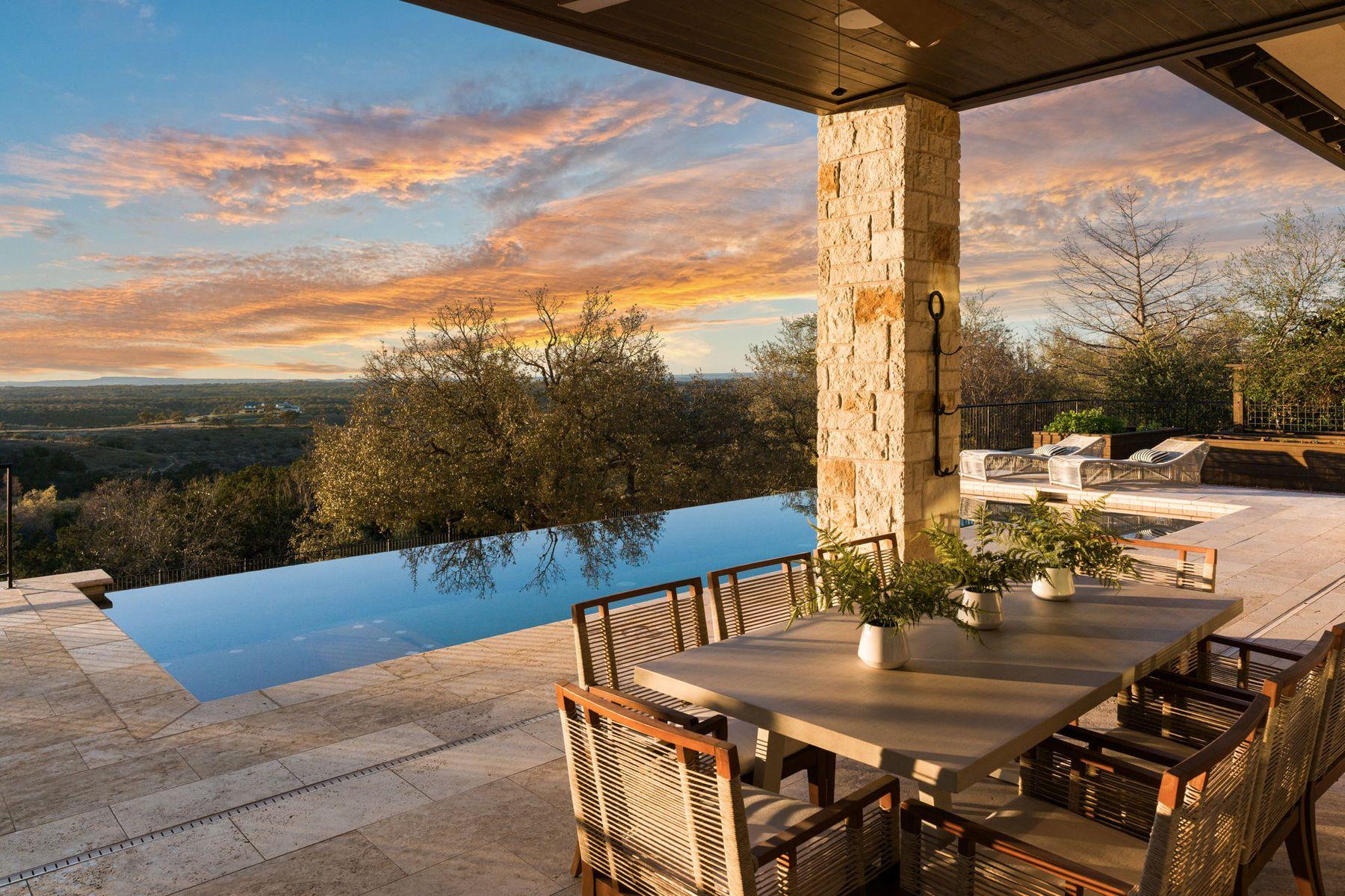 Perched high within the gated community of Belvedere, this exceptional Craftsman-style estate captures sweeping, unobstructed views of the Texas Hill Country that stretch for miles—creating a living panorama that shifts beautifully from sunrise to sunset. Gorgeous vistas greet you the moment you enter, drawing natural light deep into the home and creating a seamless connection to the surrounding landscape. Open floorplan with soaring ceilings balances inviting gathering spaces. Stunning kitchen features Wolf appliances, soapstone countertops, and a slate tile backsplash, flowing effortlessly into the breakfast nook and living room, Dedicated coffee and beverage bar enhances everyday living. Expansive rear windows frame the horizon from nearly every main living space. Main level includes a light-filled primary suite and an adjoining flex space ideal for a fitness area, reading nook, or nursery. The spa-inspired bath offers an oversized dual-faucet walk-in shower with soapstone tile and a spacious custom closet. A private guest suite with ensuite bath and a dedicated office with it's own entrance complete the main floor. Upstairs, two additional bedrooms and baths, one ensuite are paired with a generous bonus room. Outdoor living is equally impressive, with a covered patio and stone fireplace, a pool with a dramatic waterfall edge, outdoor kitchen, raised garden beds, and a bocce ball court beneath beautiful oak trees—an ideal setting for sunset evenings and relaxed gatherings. Additional highlights include an oversized 3 car garage wired for a lift, Tesla charging station, solar panels with backup batteries providing up to 50% renewable energy, a private wellness nook with a 7 person sauna and cold plunge, surround sound in the living room and patio, and customizable Lifx smart lighting. Elevated above it all, this home offers a rare sense of tranquility where open skies, rolling terrain, and extraordinary Hill Country views become part of everyday life.