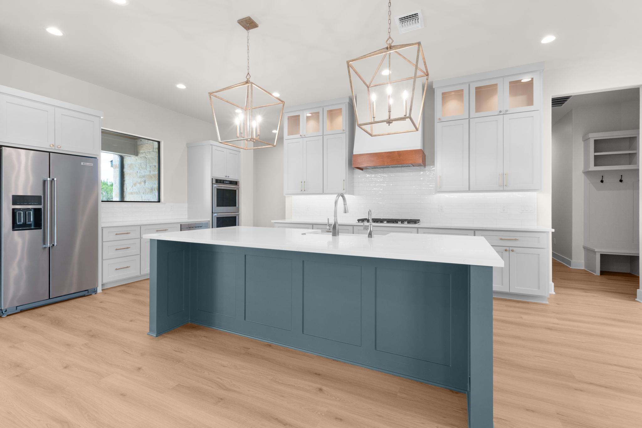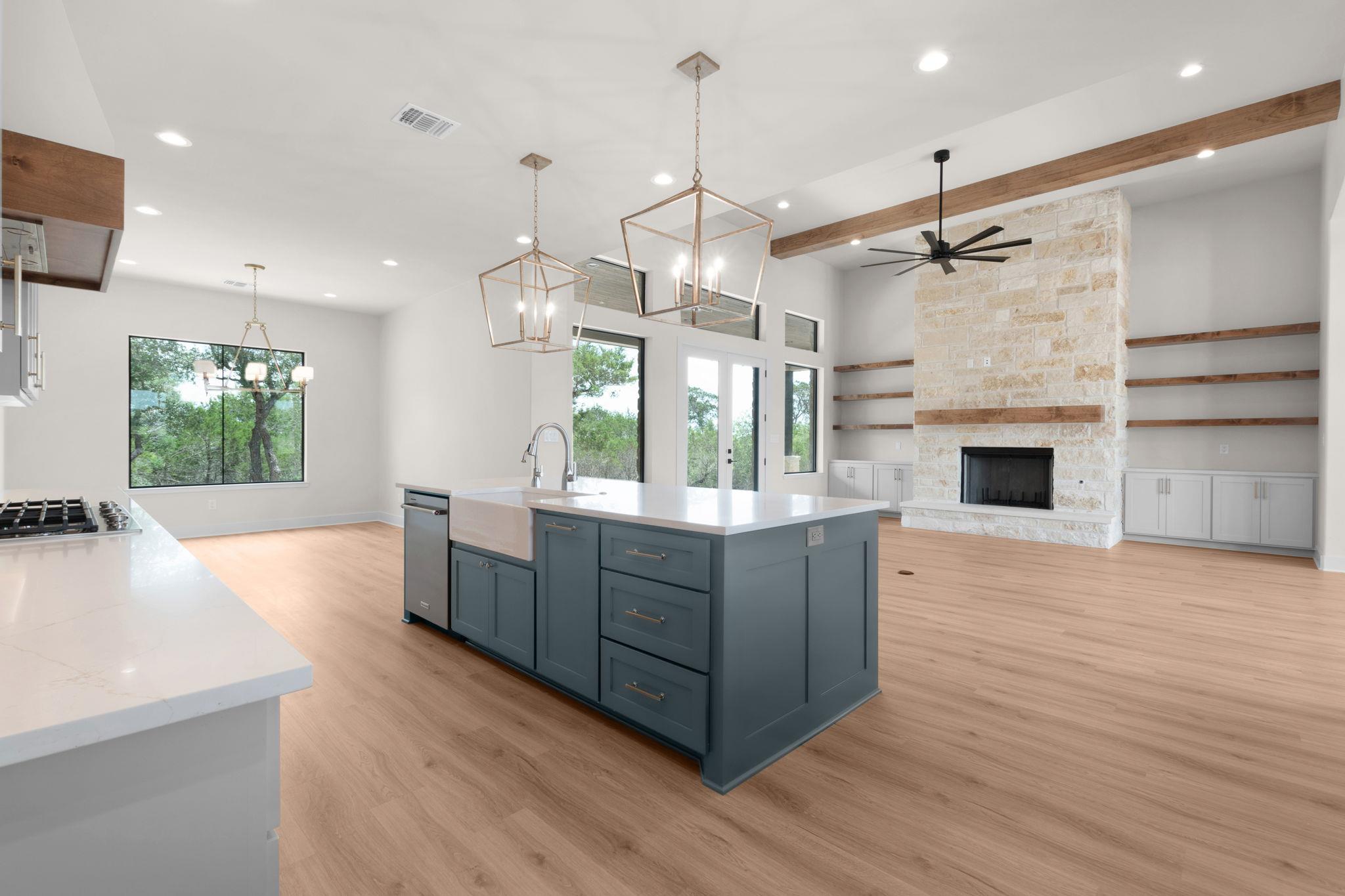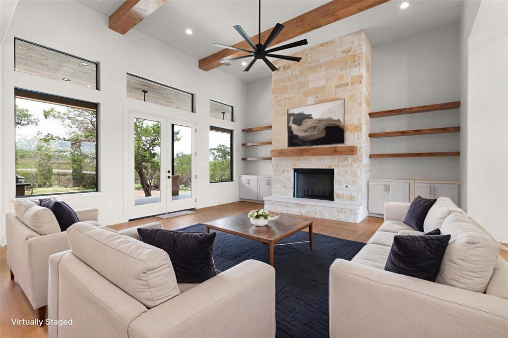 Inviting single-story home by Jon Morgan Homes on a beautiful 5-acre tract in the gated community of Burnet Oaks. This thoughtfully designed 3-bedroom + study, 3.5-bath home centers around a sun-filled living, kitchen, and dining area with soaring ceilings and seamless access to a covered patio featuring a built-in outdoor grill. The well-appointed kitchen includes a KitchenAid appliance package, striking Quartzite countertops, custom cabinetry, and under/over-cabinet LED lighting. The private primary suite offers a spa-like bath with oversized walk-in shower and a spacious walk-in closet with built-ins. A dedicated study with closet can serve as an optional 4th bedroom. Each guest bedroom includes its own en-suite bath and walk-in closet. Additional highlights: oversized 3-car garage, iron entry door, 16' entry ceilings, and Wi-Fi programmable thermostat. A rare blend of luxury, function, and acreage living.