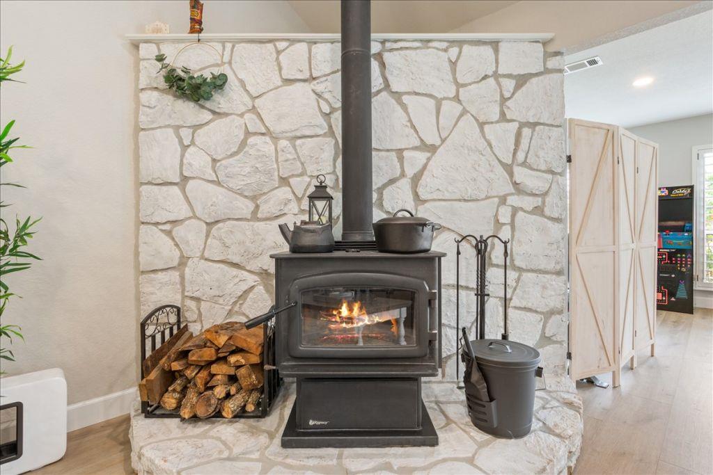 Turnkey 5-Acre Compound in Hawes Ranch - Georgetown ISD. Fully remodeled one-story main house (2400 sqft, 3 bed, 2.5 bath) plus separate 800 sqft casita (2 bed, 1 bath). 484K in documented upgrades (2022-2025). MAIN HOUSE: Metal roof (2022), all windows replaced (2022), wood plantation shutters, complete kitchen remodel with quartz and marble countertops, custom island with seating, glass-front upper cabinets, herringbone tile backsplash, Samsung stainless appliances, farmhouse pendant lighting, vaulted ceilings. Master suite with tray ceiling, marble-tiled walk-in shower with glass enclosure, dual vanity with quartz countertops, matte black fixtures. Flooring replaced (2025) - ceramic tile in wet areas, wood core laminate in living areas. No carpet. Variable speed heat pump HVAC (2024), canned lighting with dimmers, limestone surround wood-burning stove, whole-house water filter, softener, and RO system. ENERGY AND TECHNOLOGY: EcoFlow whole-home battery backup with dual battery towers and smart panel (owned), EV charging station, electrical sub panel with solar and generator capability, Cat6 wired networking, Starlink satellite internet backup, security camera and alarm system, surge and EMP protection. CASITA: Independent mini-split HVAC, luxury vinyl plank flooring, LG stainless appliances (2022), canned lighting, ceiling fans. Full kitchen, living area, 2 bedrooms, full bath. Turnkey and income-ready. PROPERTY: Red metal barn (40x60) with center tractor bay and dual enclosed storage bays, 2nd electrical meter for barn and deep water well, well shed, 14000 gallon pool with vinyl liner and LED light (2025), variable speed pool pump with DE filter, spa-ready hookup with dedicated power, RV hookup with electric and sewer, 6-foot privacy fencing with horizontal cedar accents and solar-powered gates, smart irrigation, raised garden beds, paver patios (2024). Mature oak, maple, and cedar trees throughout. Minutes to Lake Georgetown, Ronald Reagan Blvd, and 183.