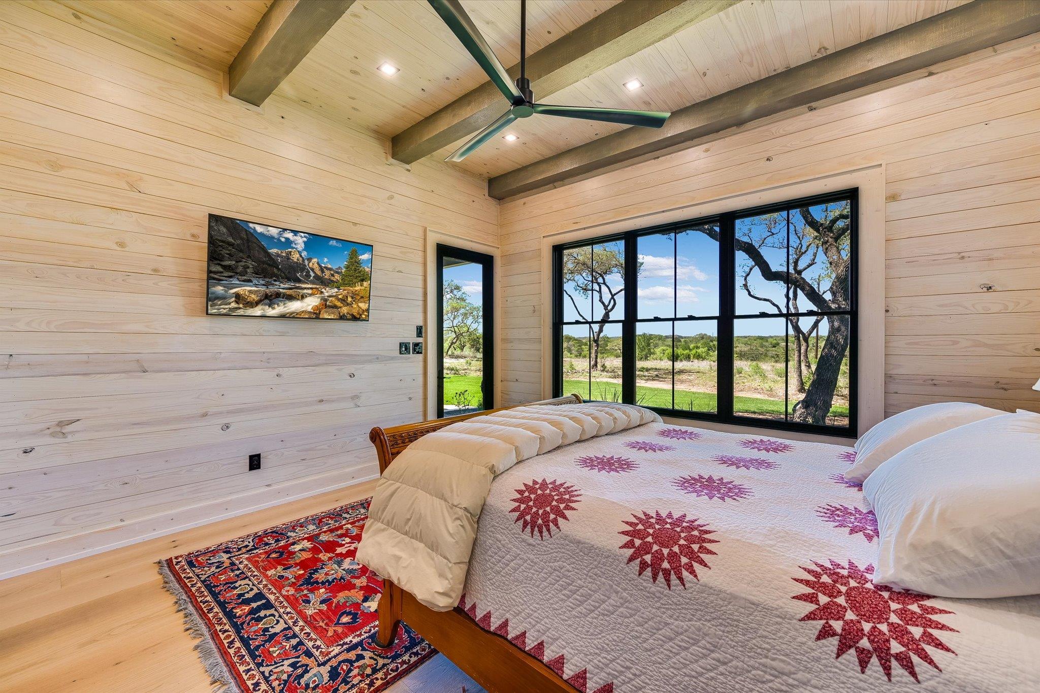 Magnificently built Custom Home on almost 15 acres-This home is in pristine condition and owner would like to sell completely furnished-Home was completed earlier this year-Beautiful wood floors with walls made of white pine-Hill country views toward the west-Very open floorplan-Kitchen has countertops and island made of Quartz, Bosch stainless steel appliances, microwave, oven and dishwasher, 5 burner gas cooktop, tile backsplash and a large sink-Living area has solid beams in the ceiling-Barn sliding doors in the house-Metal roof-Master is very large with views of the hill country-Master bath has double vanity, large walk-in shower and a bowled tub a big walk-in closet with lots of shelves and built-in drawers-Huge oversized garage with extra storage room-Landscaping has rock raised flower beds-Pella windows-Property has a well with 2500 water gallon storage tank