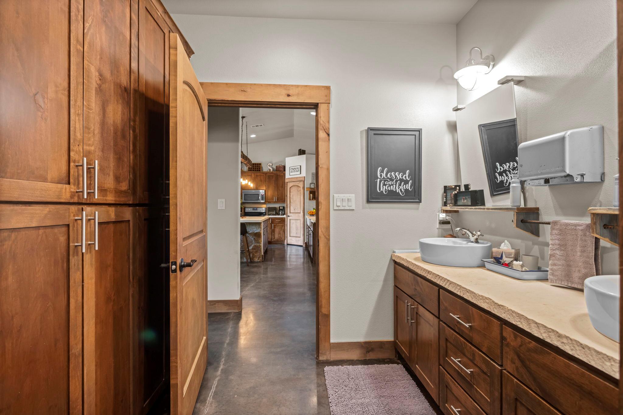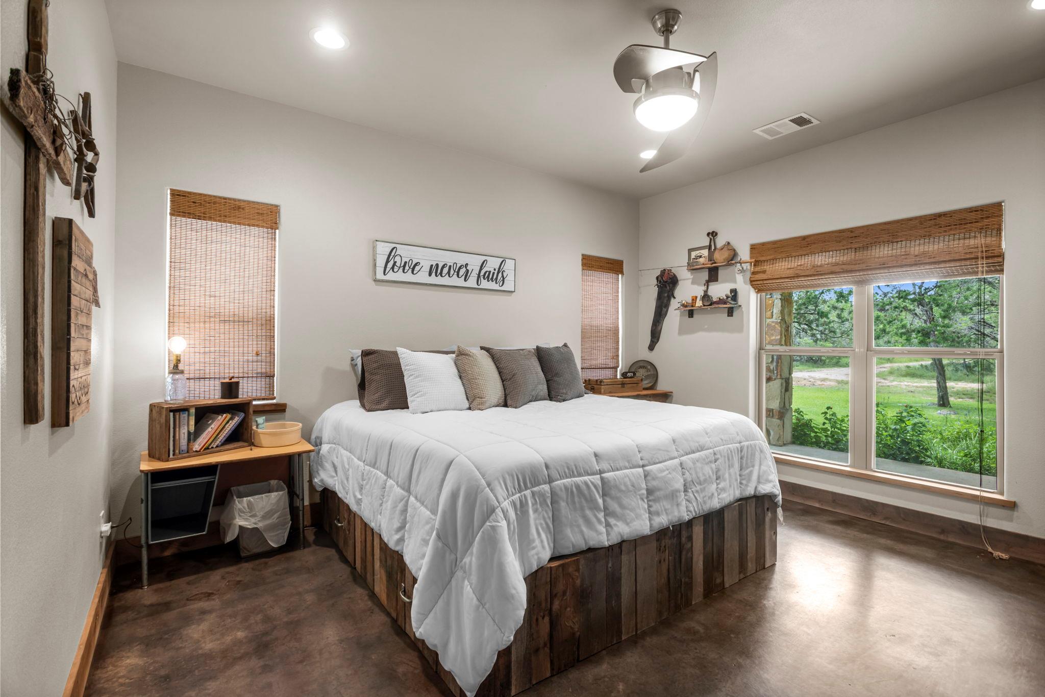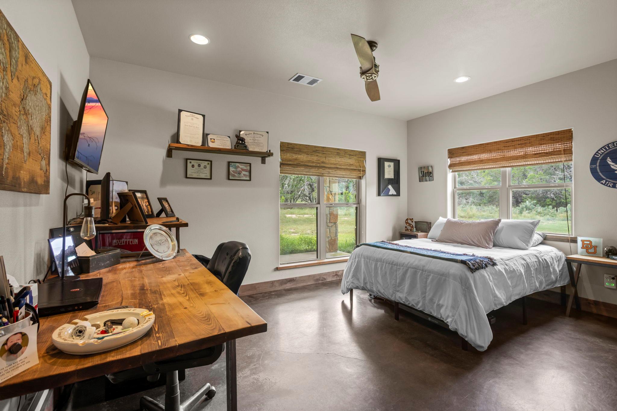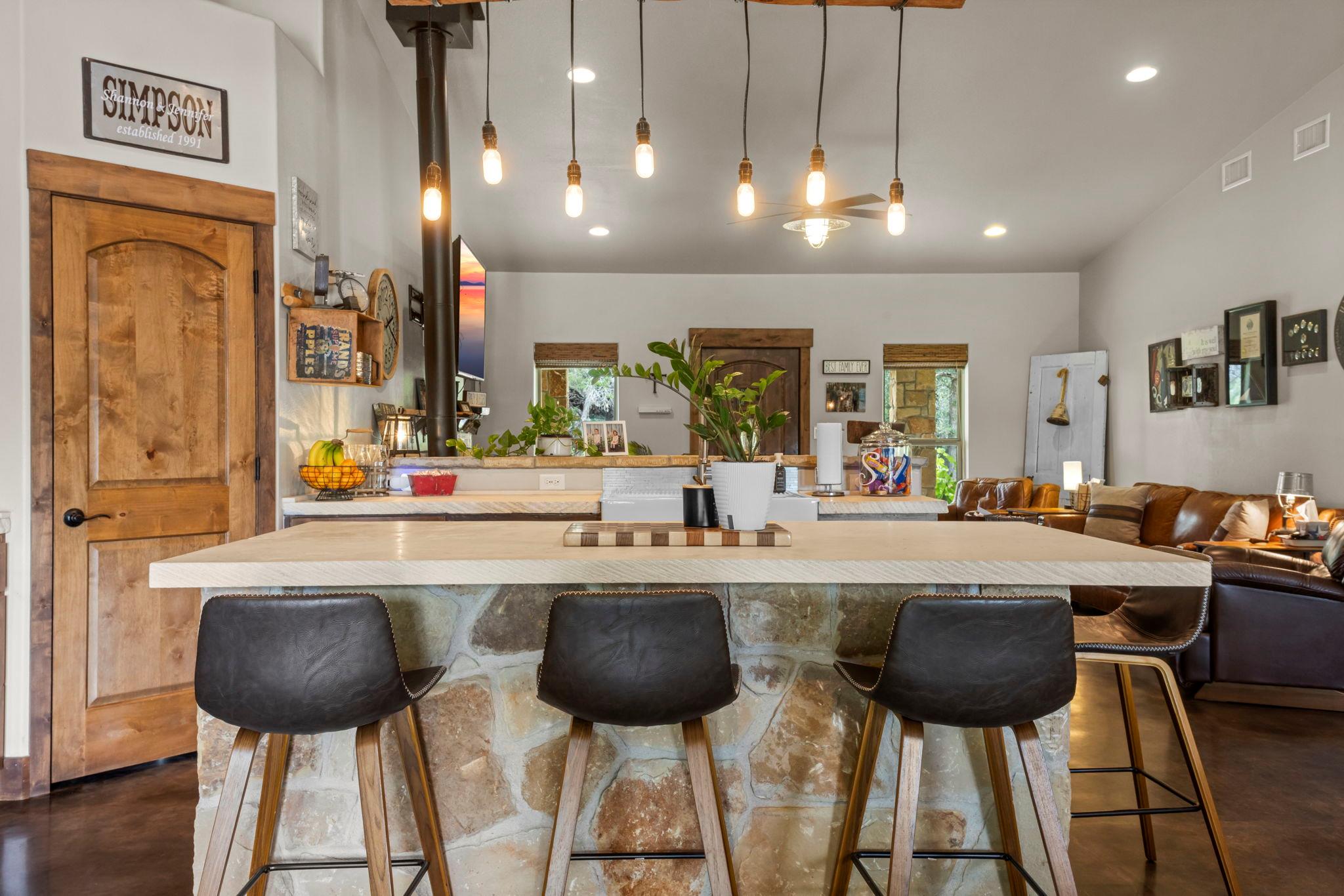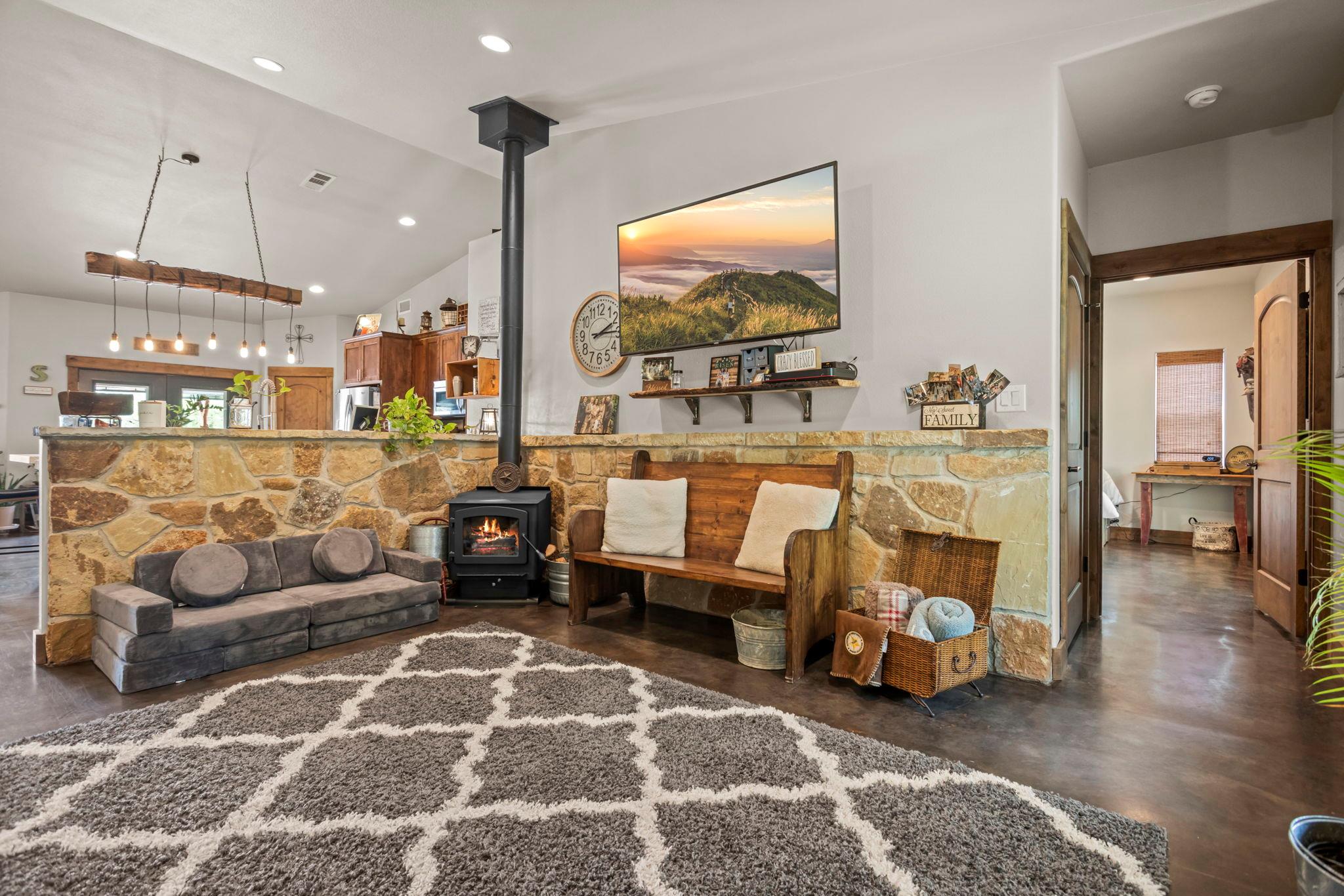 PRICE IMPROVED! Set on 4 peaceful, oak-covered acres, this custom sandstone ranch offers a rare blend of privacy, craftsmanship, and comfort. Designed with both durability and style in mind, the home features an open-concept layout, concrete flooring throughout, and a wood-burning stove that adds warmth and character to the living space. Outdoor living is a true highlight. Wide covered porches provide the perfect setting for quiet mornings or relaxed evenings, while the in-ground pool offers a refreshing retreat during warmer months. The property is fully fenced with an automatic gated entrance, creating a sense of security and seclusion that’s increasingly hard to find. Significant updates and infrastructure add long-term value, including a new metal roof, sprinkler system, and a high-producing water well delivering approximately 75 gallons per minute. For added flexibility, the 1,200-square-foot shop—complete with a full bathroom—offers excellent space for hobbies, storage, or a home-based workspace. Recently reintroduced to the market at a new price, this property presents an exceptional opportunity for buyers seeking space, privacy, and quality finishes, all within reach of everyday conveniences.