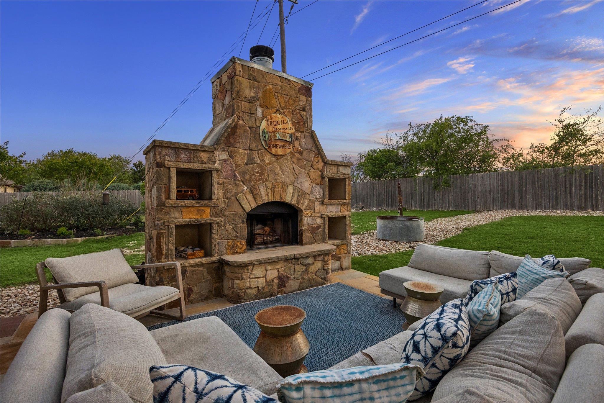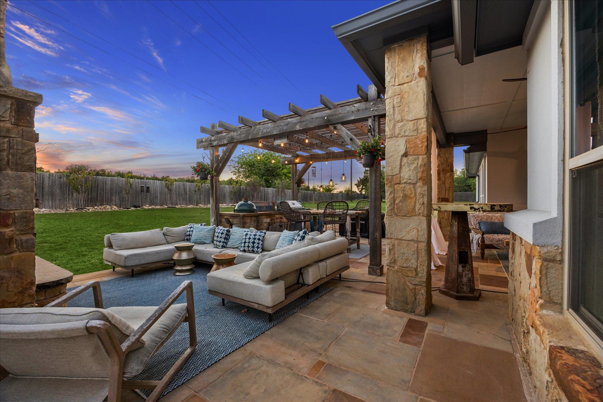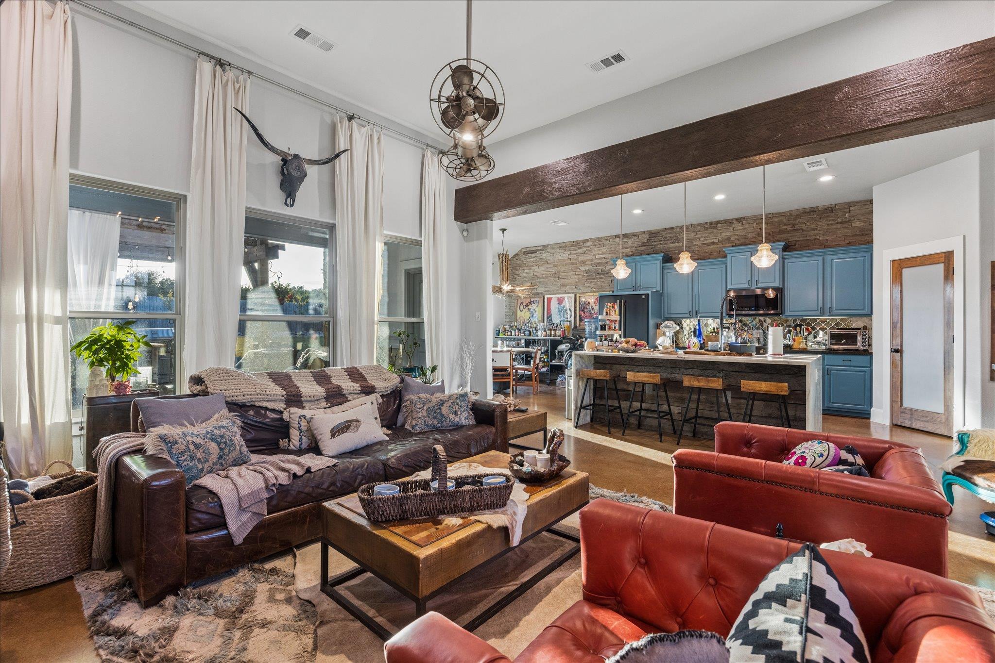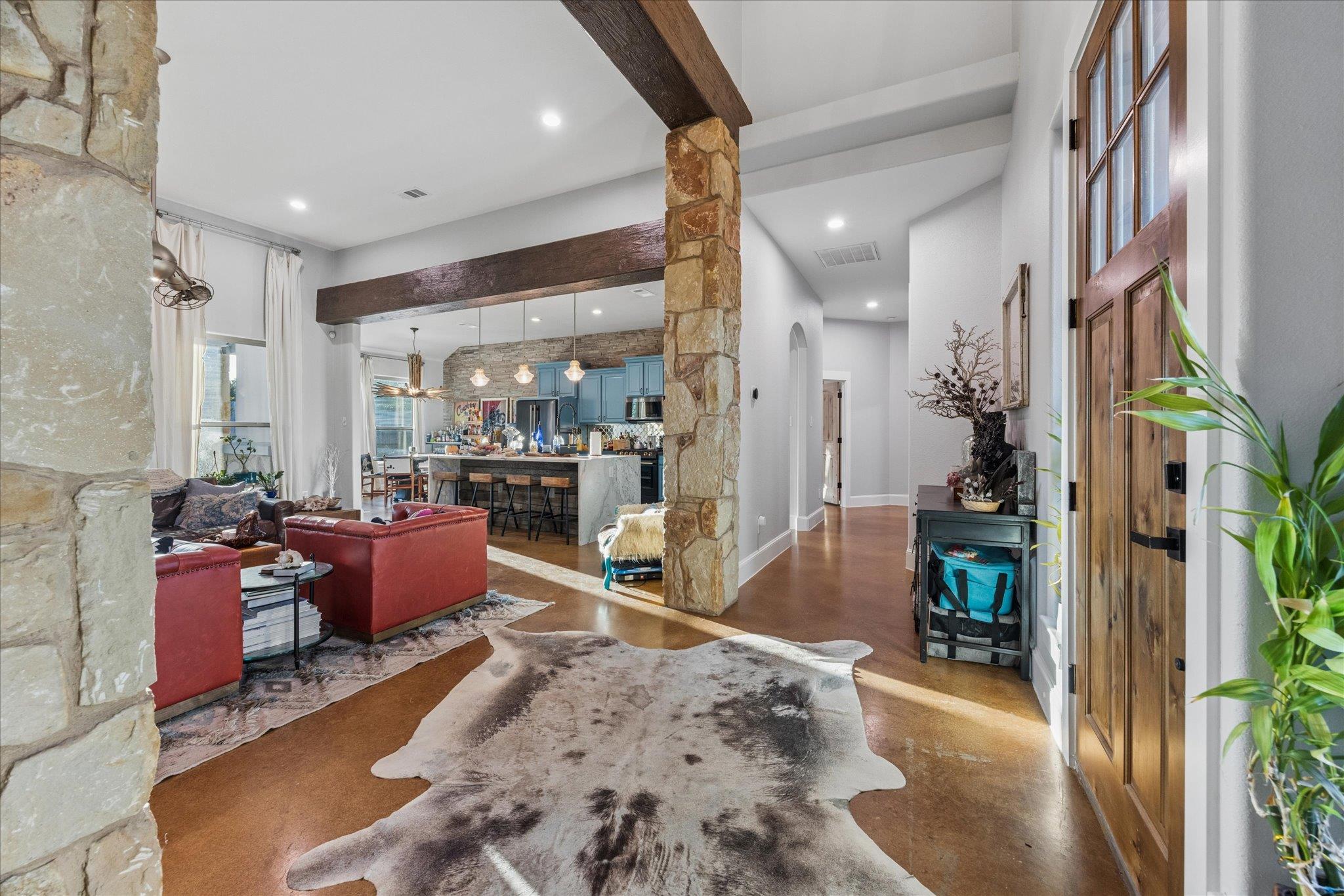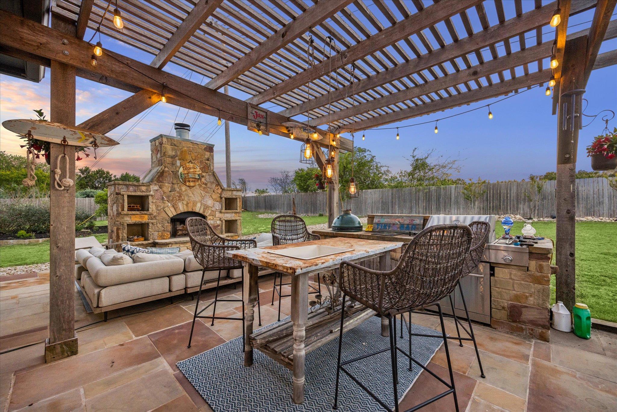 Open concept single-story ranch-style home with custom finishes throughout. Set on one acre +/- lot, this four-bedroom layout includes a dedicated French-door office and open living areas with multiple outdoor spaces. Statement turquoise front door opens to beamed entry highlighted by a Restoration Hardware chandelier, setting the tone for eclectic designer fixtures that convey throughout. West-facing windows offer Hill Country tree-lined views that reinforce the natural surroundings. Anchored by a striking floor-to-ceiling sandstone fireplace, the living room flows seamlessly into the freshly updated kitchen and dining space, showcasing rustic stained concrete flooring throughout. The kitchen serves as the centerpiece of the home with custom Venetian glass backsplash and pendant lighting framing brand-new Forno appliances, including range and dishwasher. Dramatic marble waterfall island extends into the dining space beneath eye-catching driftwood chandelier. The primary suite offers a spacious retreat with vaulted tray ceiling and sheer bamboo window coverings accenting outdoors. Remodeled primary bathroom features floor-to-ceiling ceramic tile in walk-in shower, moonstone countertops, wood vanities with copper hardware, leathered granite shelving nooks, and his-and-her closets. Outdoor living begins with covered sandstone patio with dual fans, outdoor BBQ kitchen with Green Egg, KitchenAid gas grill, cedar pergola with exterior lighting, and second fireplace near the patio, with an additional firepit out back. Custom GK Pool installed in 2020 includes a beach landing with waterfall feature and umbrella set for resort-style experience. See MLS docs for full upgrades list including 2021 Ringer windows, 2018 roof replacement with 150-mph shingles, HVAC service, and fresh interior paint. Oversized 3-car garage with extended driveway and sport court provides ample parking, with convenient access to Hwy 29 and Hwy 183 and close proximity to Austin.