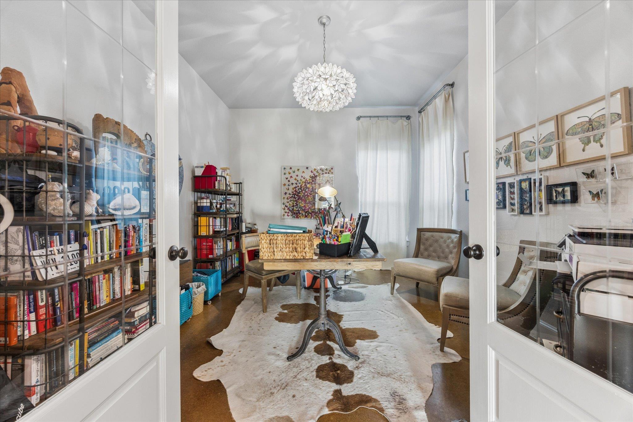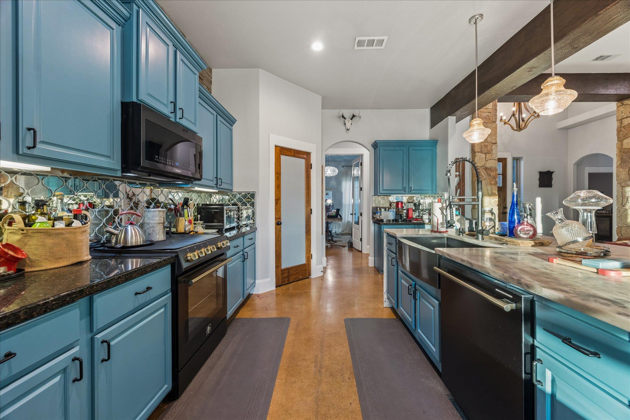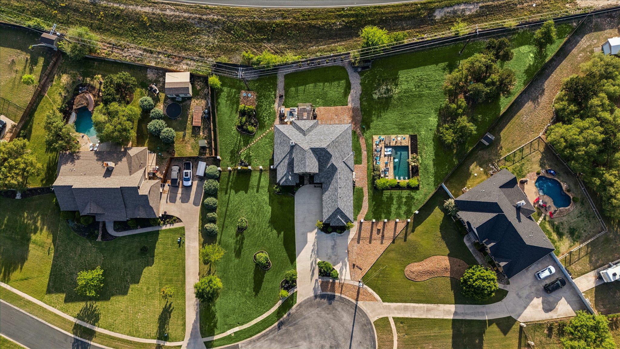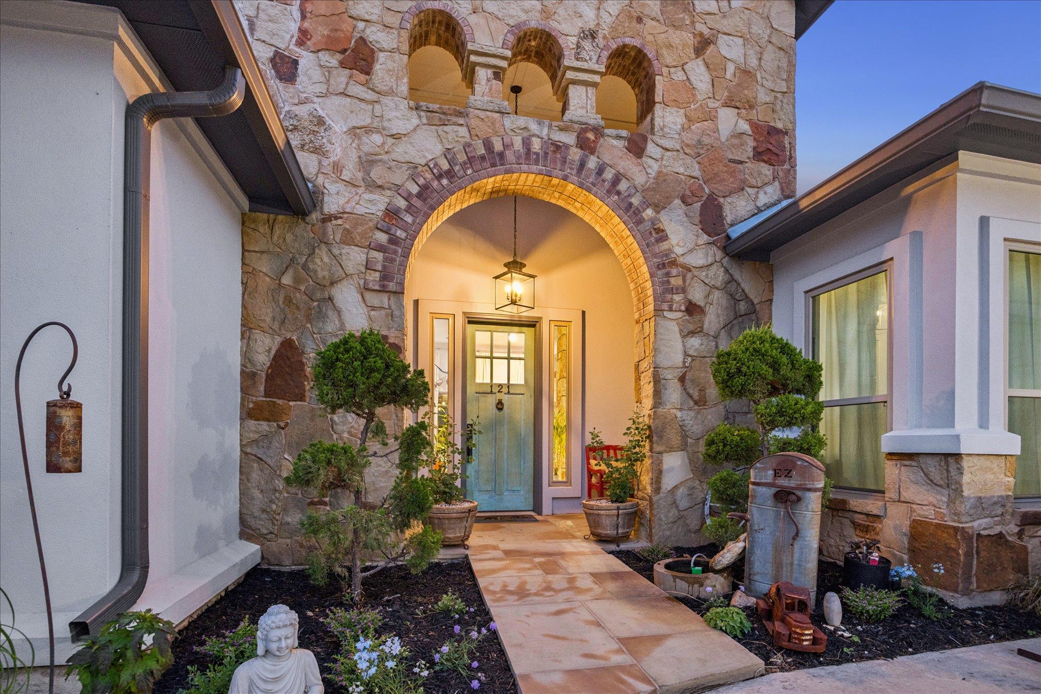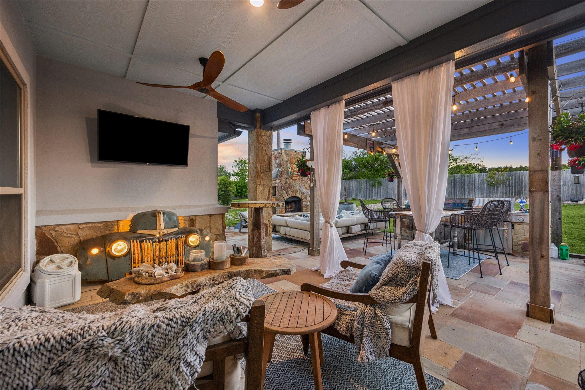 Open concept single-story ranch-style home with custom finishes throughout. Set on one acre +/- lot, this four-bedroom layout includes a dedicated French-door office and open living areas with multiple outdoor spaces. Statement turquoise front door opens to beamed entry highlighted by a Restoration Hardware chandelier, setting the tone for eclectic designer fixtures that convey throughout. West-facing windows offer Hill Country tree-lined views that reinforce the natural surroundings. Anchored by a striking floor-to-ceiling sandstone fireplace, the living room flows seamlessly into the freshly updated kitchen and dining space, showcasing rustic stained concrete flooring throughout. The kitchen serves as the centerpiece of the home with custom Venetian glass backsplash and pendant lighting framing brand-new Forno appliances, including range and dishwasher. Dramatic marble waterfall island extends into the dining space beneath eye-catching driftwood chandelier. The primary suite offers a spacious retreat with vaulted tray ceiling and sheer bamboo window coverings accenting outdoors. Remodeled primary bathroom features floor-to-ceiling ceramic tile in walk-in shower, moonstone countertops, wood vanities with copper hardware, leathered granite shelving nooks, and his-and-her closets. Outdoor living begins with covered sandstone patio with dual fans, outdoor BBQ kitchen with Green Egg, KitchenAid gas grill, cedar pergola with exterior lighting, and second fireplace near the patio, with an additional firepit out back. Custom GK Pool installed in 2020 includes a beach landing with waterfall feature and umbrella set for resort-style experience. See MLS docs for full upgrades list including 2021 Ringer windows, 2018 roof replacement with 150-mph shingles, HVAC service, and fresh interior paint. Oversized 3-car garage with extended driveway and sport court provides ample parking, with convenient access to Hwy 29 and Hwy 183 and close proximity to Austin.