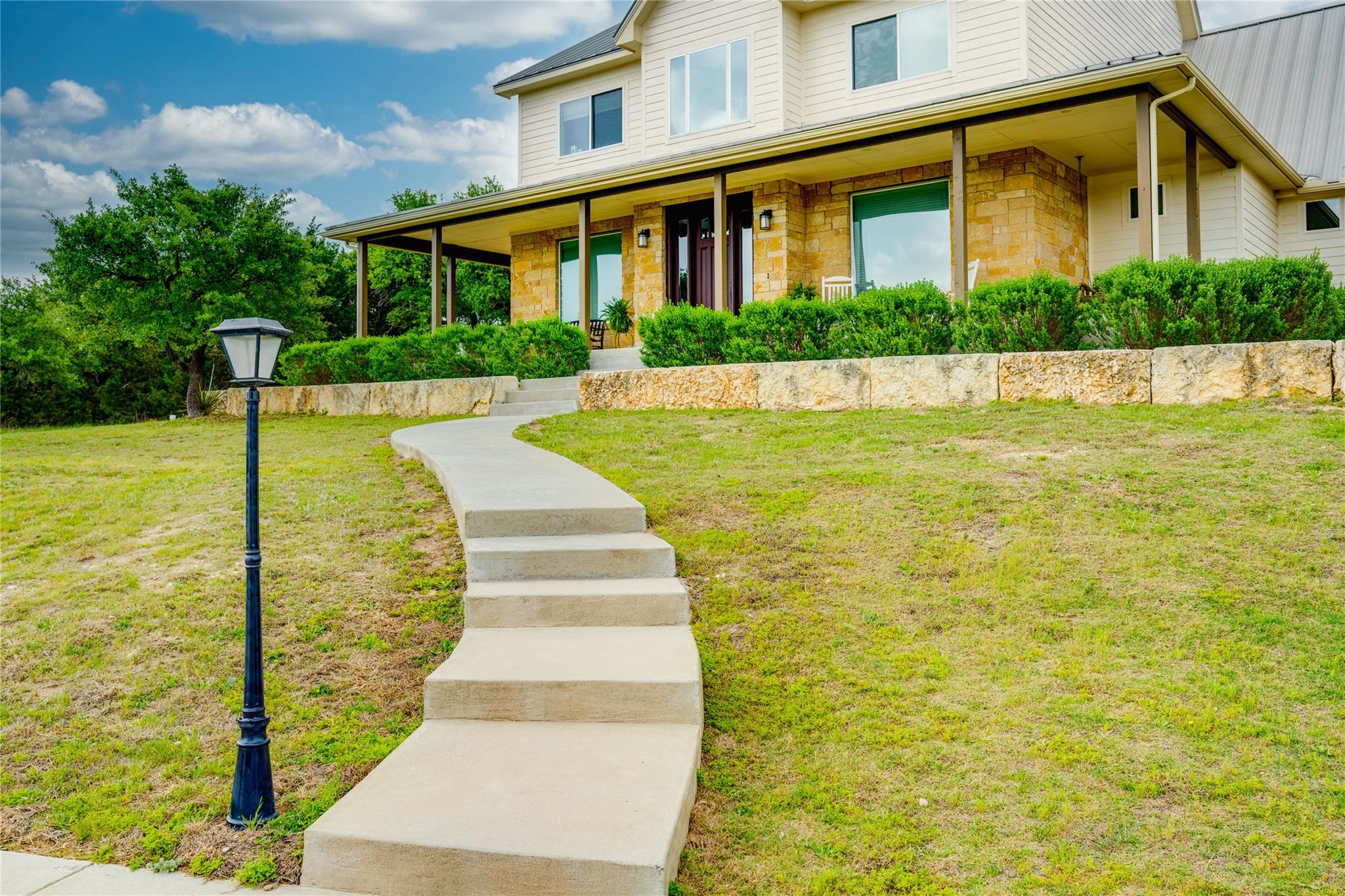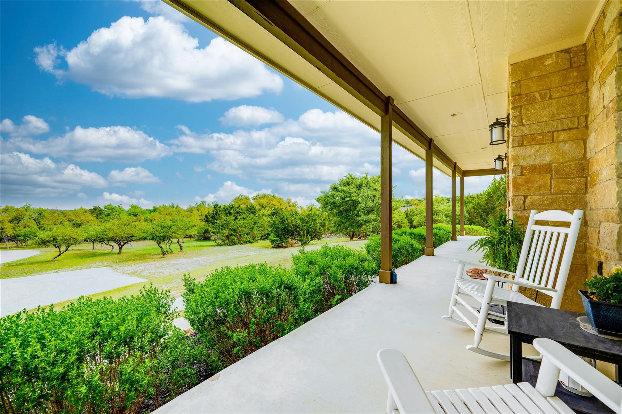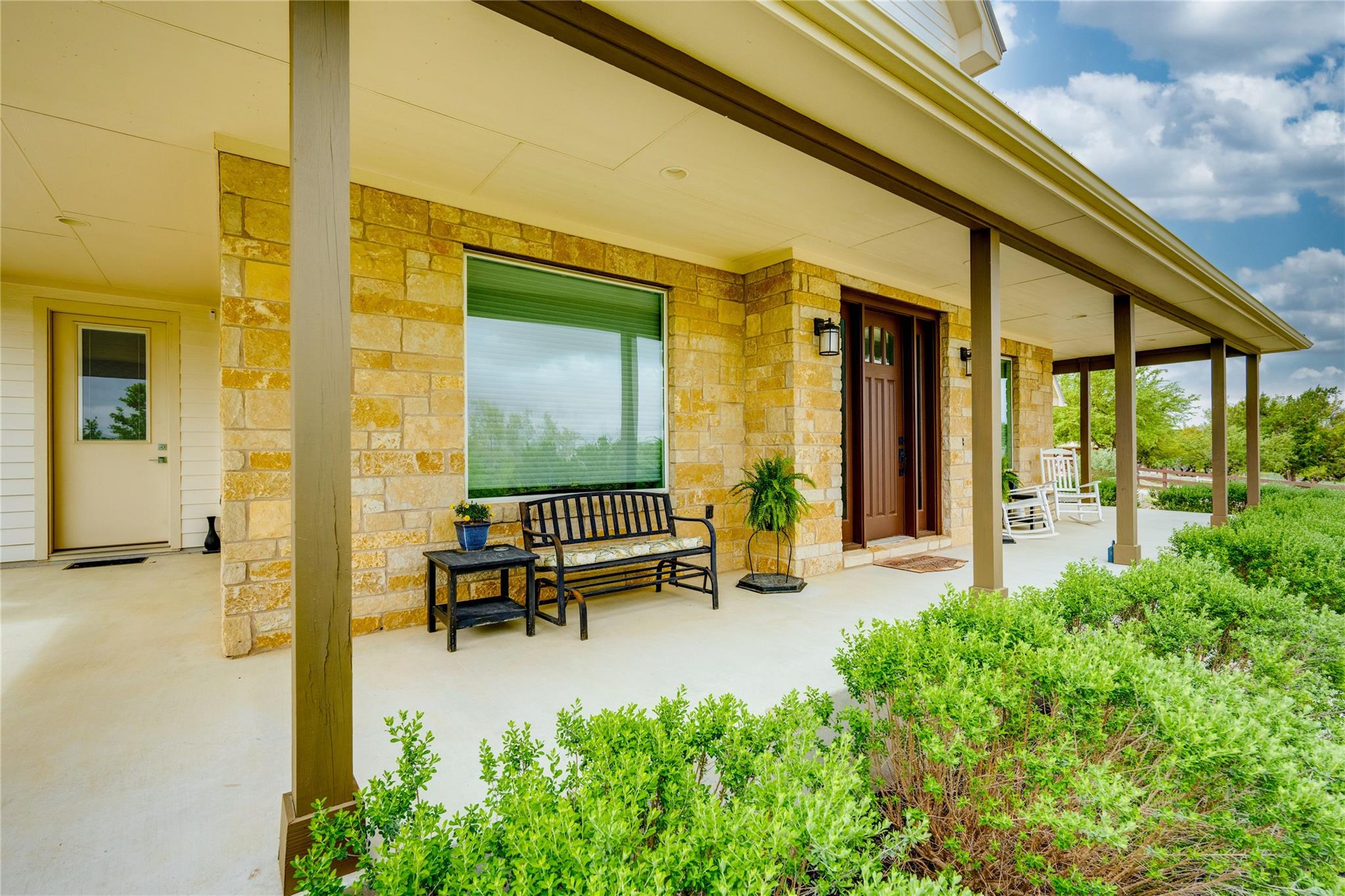 1051 Trailhead Circle unfolds like a Hill Country daydream in the highly sought after & gated, Settlers Point Subdivision. Tucked away on a peaceful cul-de-sac, this custom-built home, rests on just over five, fully-fenced, acres. Thoughtfully designed for both comfort and connection—to nature, to animals, and to a more grounded way of living. Horses are welcome in this upscale equine community. Boasting a horse stable, corral, & large paddock ready for riding, grazing, and open-air freedom. When you're ready to relax, jump into the sparkling heated pool or take a dip in the spa and enjoy the ambient sounds of the rock waterfall. Then when it's time to come inside, you can access the downstairs guest bath via the private door that is just steps from the pool. Purposefully placed, the adjacent laundry room contains an additional utility sink, utility hook-ups and plenty more storage. The kitchen offers a large quartz island and countertops, an oversized pantry, beautiful stainless KitchenAid Energy Star appliances (36" refrigerator, a high-performance induction cooktop, a built-in microwave, & dishwasher). This versatile residence has one primary bedroom downstairs and an optional primary upstairs with en-suite bath. All bedrooms welcome you with stunning views, large walk-in closets and tranquility. The upstairs additionally features a media room, a bonus room, and very large walk-in attic space. Just like any great building, some of the most important details are the one's you don't see. Constructed with Class A fire-rated materials - a metal standing seam roof, hardy board and stone exterior, this home is built to last. Other behind-the-scenes upgrades include: 25Panasonic Solar panels, a 26 kWh Generac generator that can power the whole house during an outage, a well and water tank, a propane tank, a water softener system, and and full roof gutters. This rare and serene haven in Settlers Point is a must see!