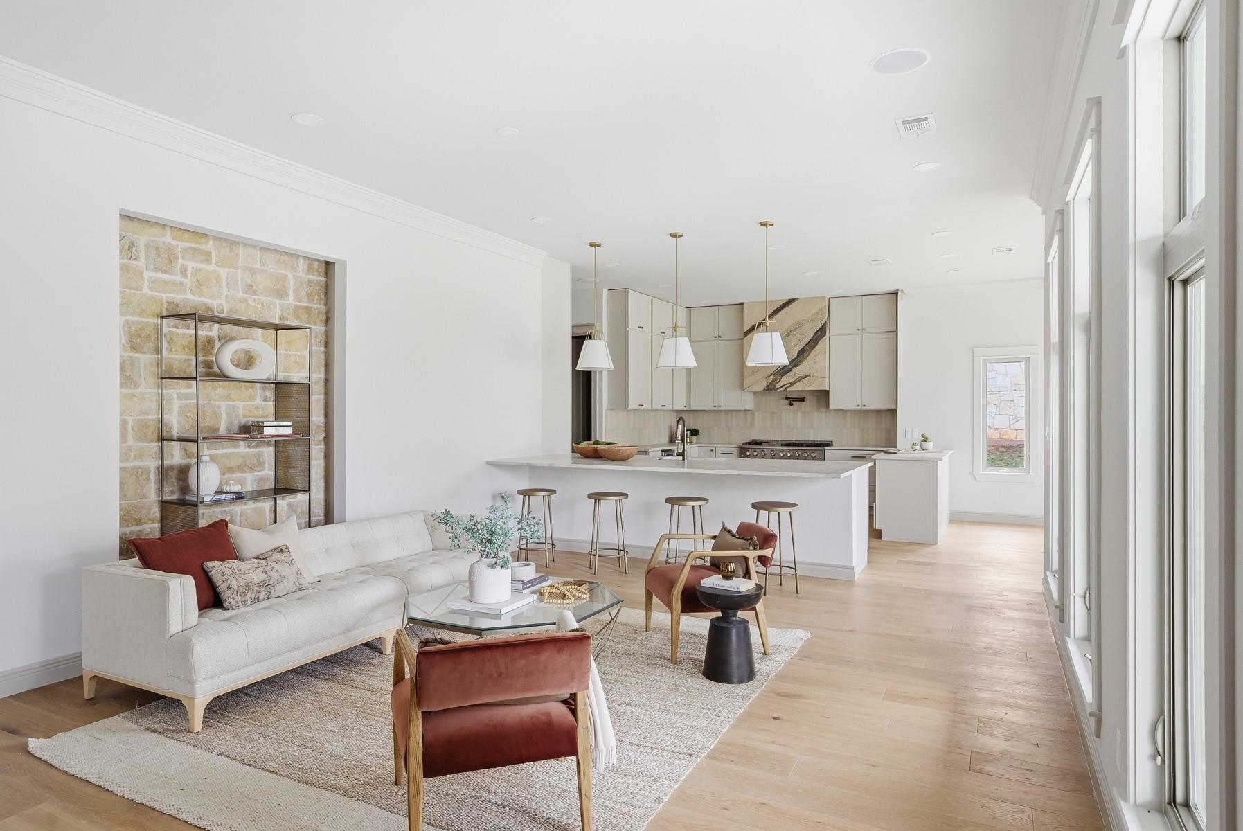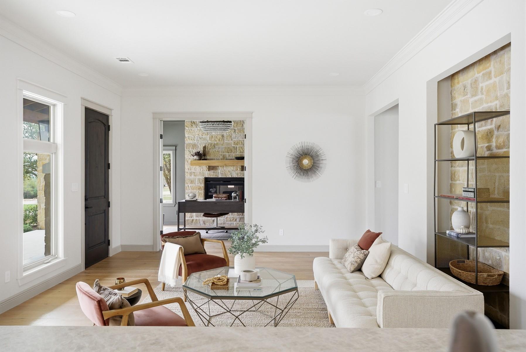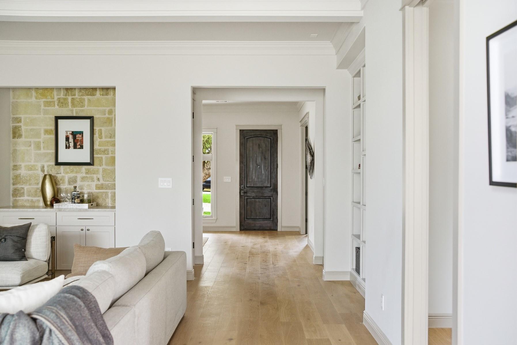 Located in the Texas Hill Country, just outside of Austin, this home sits on 1.5 acres of flat land shaded by beautiful heritage oak trees and offers a thoughtful mix of luxurious materials, comfortable living, and great spaces for entertaining. The home features 4 bedrooms and 4 full bathrooms, with all bedrooms located upstairs, creating separation between the living and private spaces. Interior finishes include white oak flooring throughout, new cabinetry, designer tile, solid-core doors, and real brass door hardware, giving the home a warm, high-quality feel. The kitchen is designed for both daily living and hosting, with Taj Mahal quartzite countertops, marble vent hood, two dishwashers, and plenty of prep and storage space. A bar area nearby makes entertaining easy. Additional spaces include a private office with a fireplace and a separate game room, offering flexibility for work, relaxation, or gatherings. The home also includes a built-in sauna for a private spa experience. Outside, the property features an outdoor kitchen, irrigation system, and a spacious yard under the canopy of mature oaks. Part of the property is fully fenced, providing a secure space for pets. Additional highlights include a metal roof, solar panels, and a buried propane tank servicing the home. With its thoughtful finishes, this may be one of the most design-forward homes in Driftwood, offering a rare blend of style, land, and Hill Country setting.