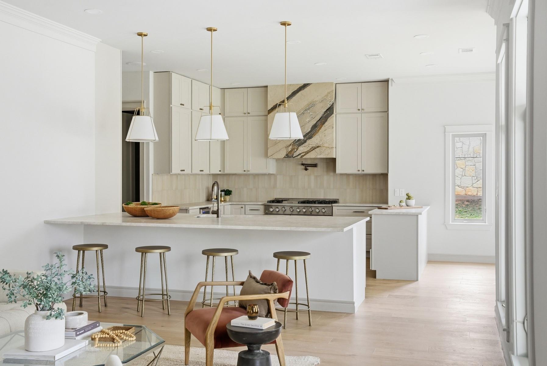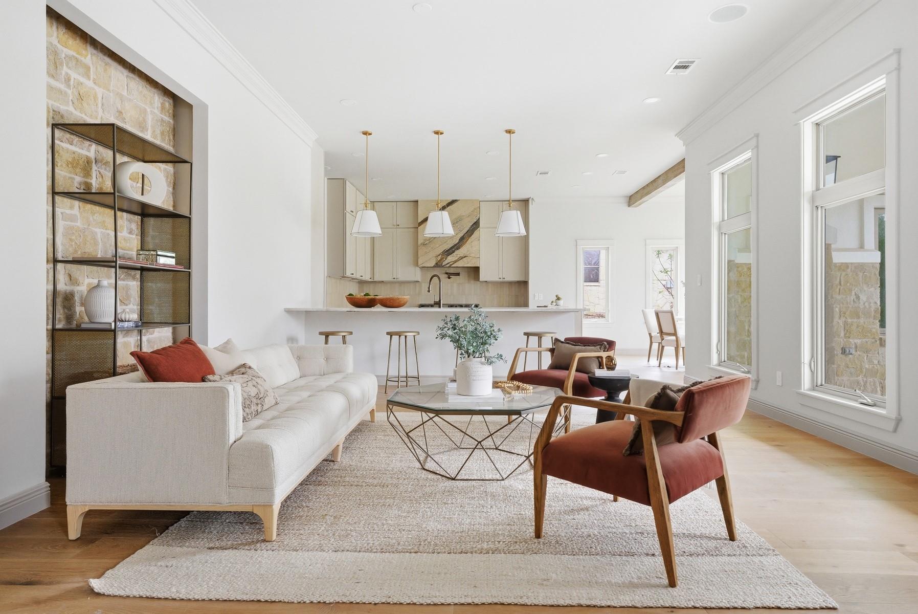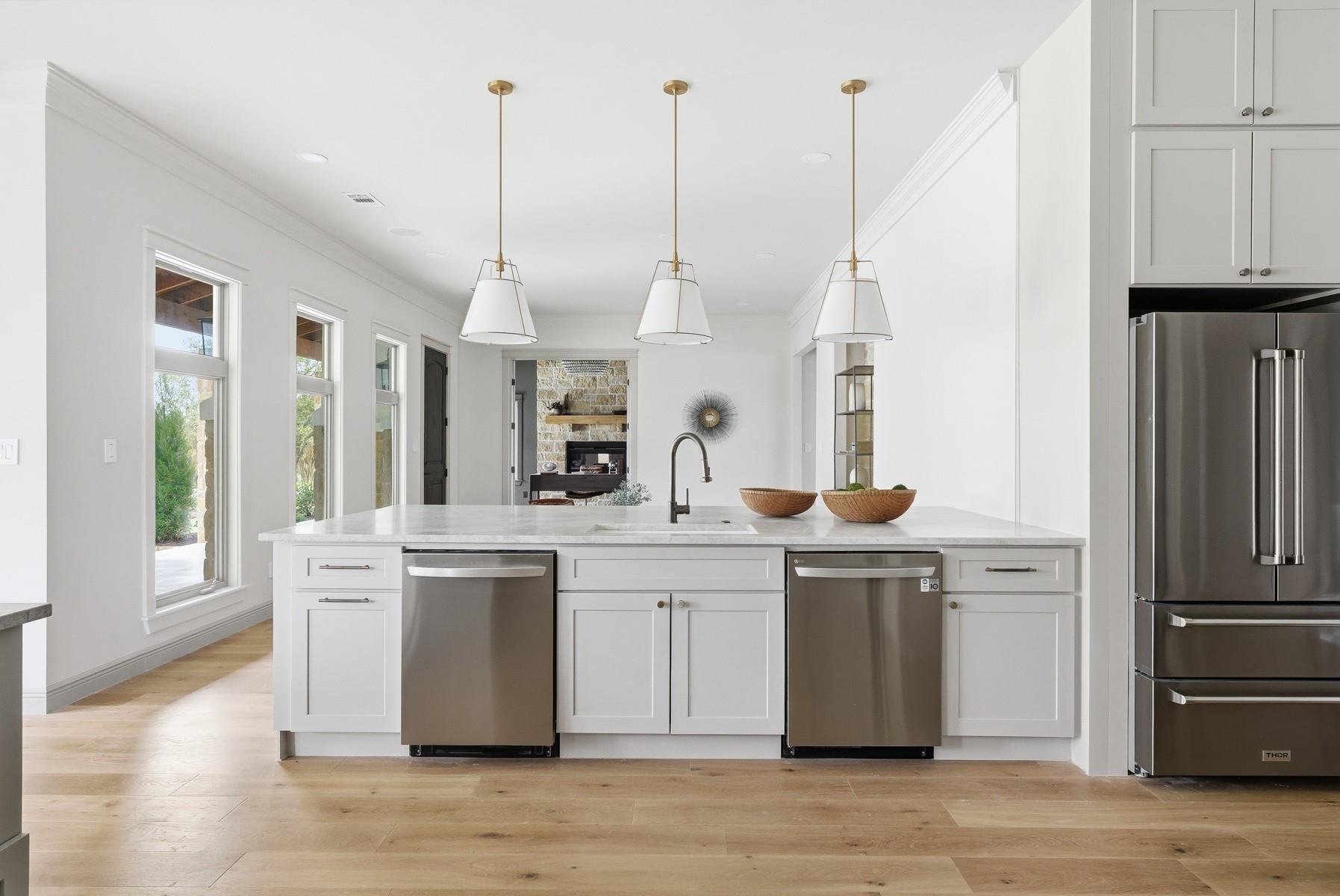 Located in the Texas Hill Country, just outside of Austin, this home sits on 1.5 acres of flat land shaded by beautiful heritage oak trees and offers a thoughtful mix of luxurious materials, comfortable living, and great spaces for entertaining. The home features 4 bedrooms and 4 full bathrooms, with all bedrooms located upstairs, creating separation between the living and private spaces. Interior finishes include white oak flooring throughout, new cabinetry, designer tile, solid-core doors, and real brass door hardware, giving the home a warm, high-quality feel. The kitchen is designed for both daily living and hosting, with Taj Mahal quartzite countertops, marble vent hood, two dishwashers, and plenty of prep and storage space. A bar area nearby makes entertaining easy. Additional spaces include a private office with a fireplace and a separate game room, offering flexibility for work, relaxation, or gatherings. The home also includes a built-in sauna for a private spa experience. Outside, the property features an outdoor kitchen, irrigation system, and a spacious yard under the canopy of mature oaks. Part of the property is fully fenced, providing a secure space for pets. Additional highlights include a metal roof, solar panels, and a buried propane tank servicing the home. With its thoughtful finishes, this may be one of the most design-forward homes in Driftwood, offering a rare blend of style, land, and Hill Country setting.