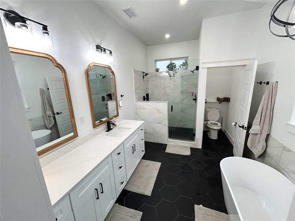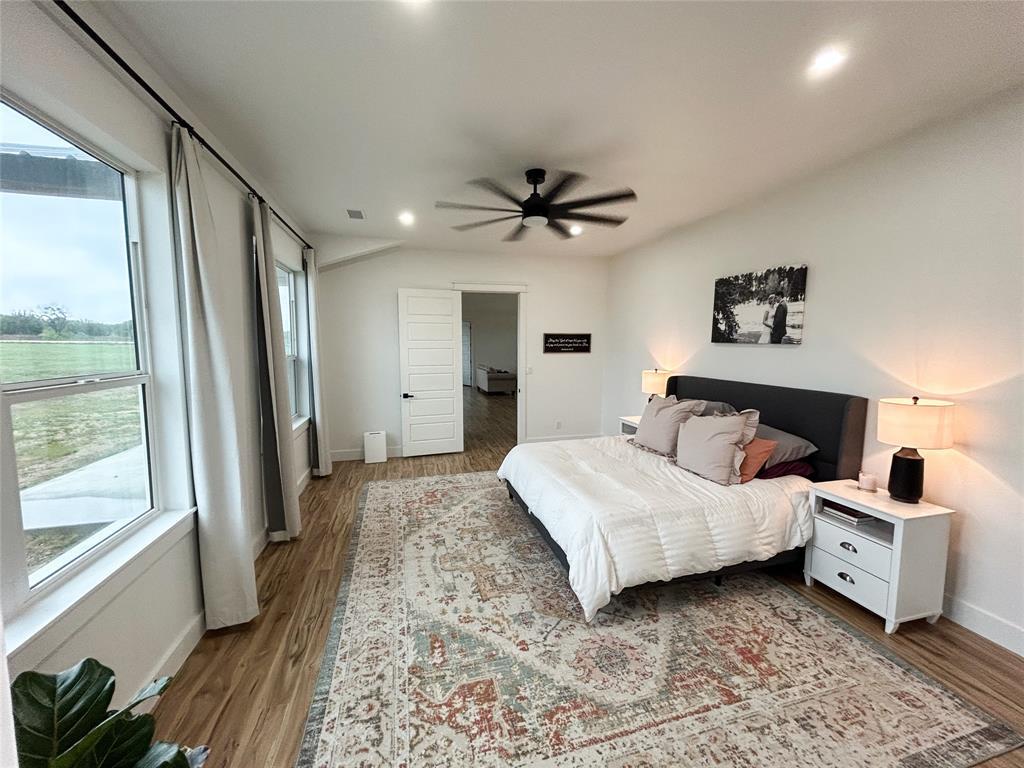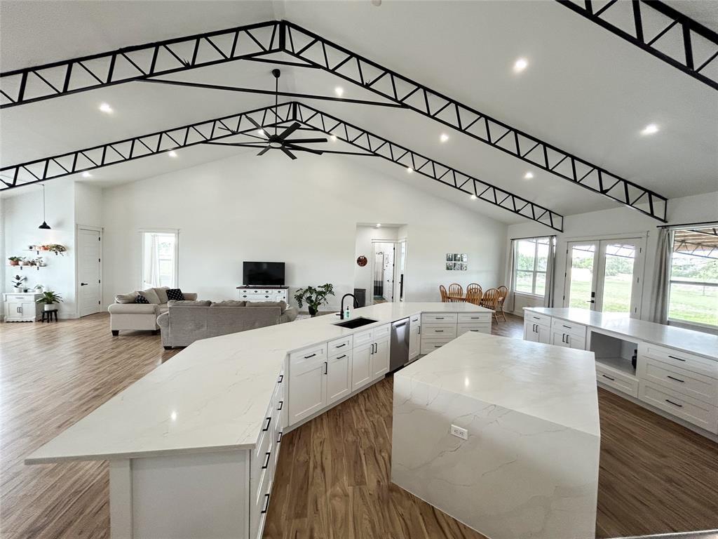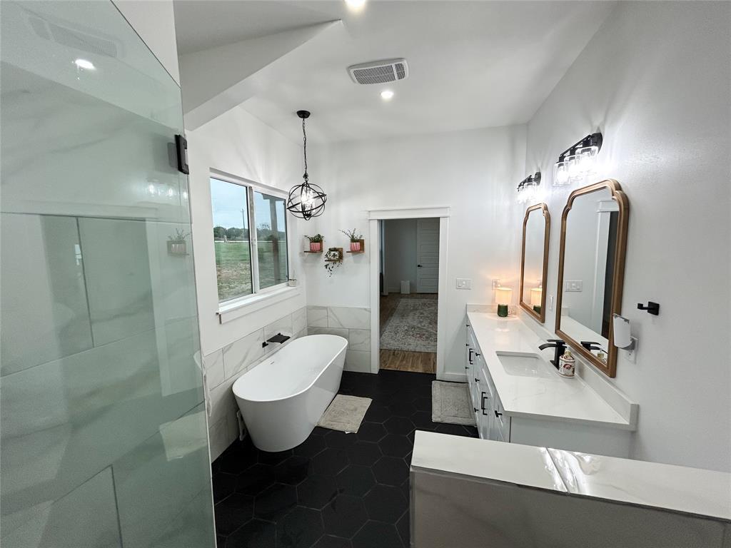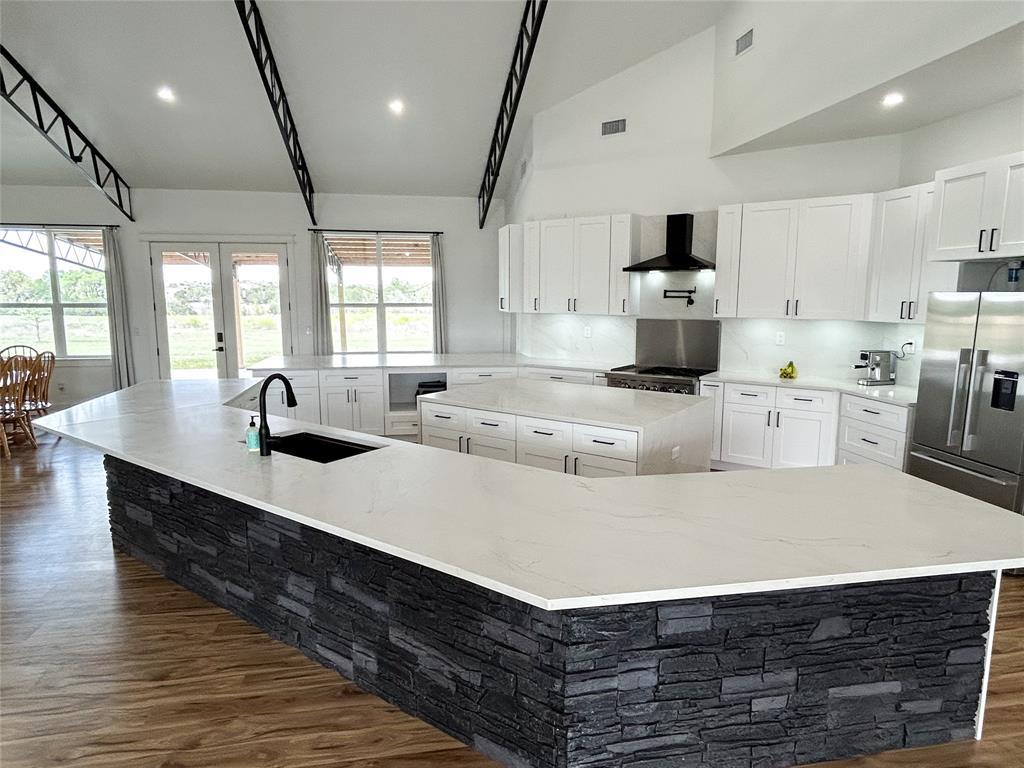 Back on the market due to buyer’s home not selling—an exceptional opportunity in Lampasas to own a modern farmhouse on 14.81 acres with over 950 feet of Patterson Creek frontage. This 4-bedroom, 3-bath home offers over 3,000 square feet of thoughtfully designed living space, ideal for buyers searching for Texas acreage, Hill Country homes, or private retreat properties. The centerpiece of the home is a one-of-a-kind 368 sq ft hexagon-shaped kitchen featuring more than 155 sq ft of quartz countertops across two oversized islands, crafted from seven slabs, complemented by 26 custom double cabinets and a commercial-grade propane range with griddle and built-in oven. The open-concept great room is filled with natural light and highlighted by soaring 17+ foot ceilings and industrial-style beams, creating a striking yet inviting space. French doors lead to a covered back porch overlooking gently rolling land down to the creek, offering peaceful views and exceptional privacy. The primary suite includes a spacious walk-in closet and a modern bath with distinctive hexagon tile. A separate mother-in-law suite with full bath provides flexibility for guests or multi-generational living, while two additional bedrooms share a full bath. Additional features include a media or bonus room, an approximately 800 sq ft three-car garage with high ceilings, RV hookups, soft carport, storage shed, spray foam insulation, mini-split systems in bedrooms, and central HVAC in the main living area. The property is partially fenced, includes an automatic gate, and no hoa.