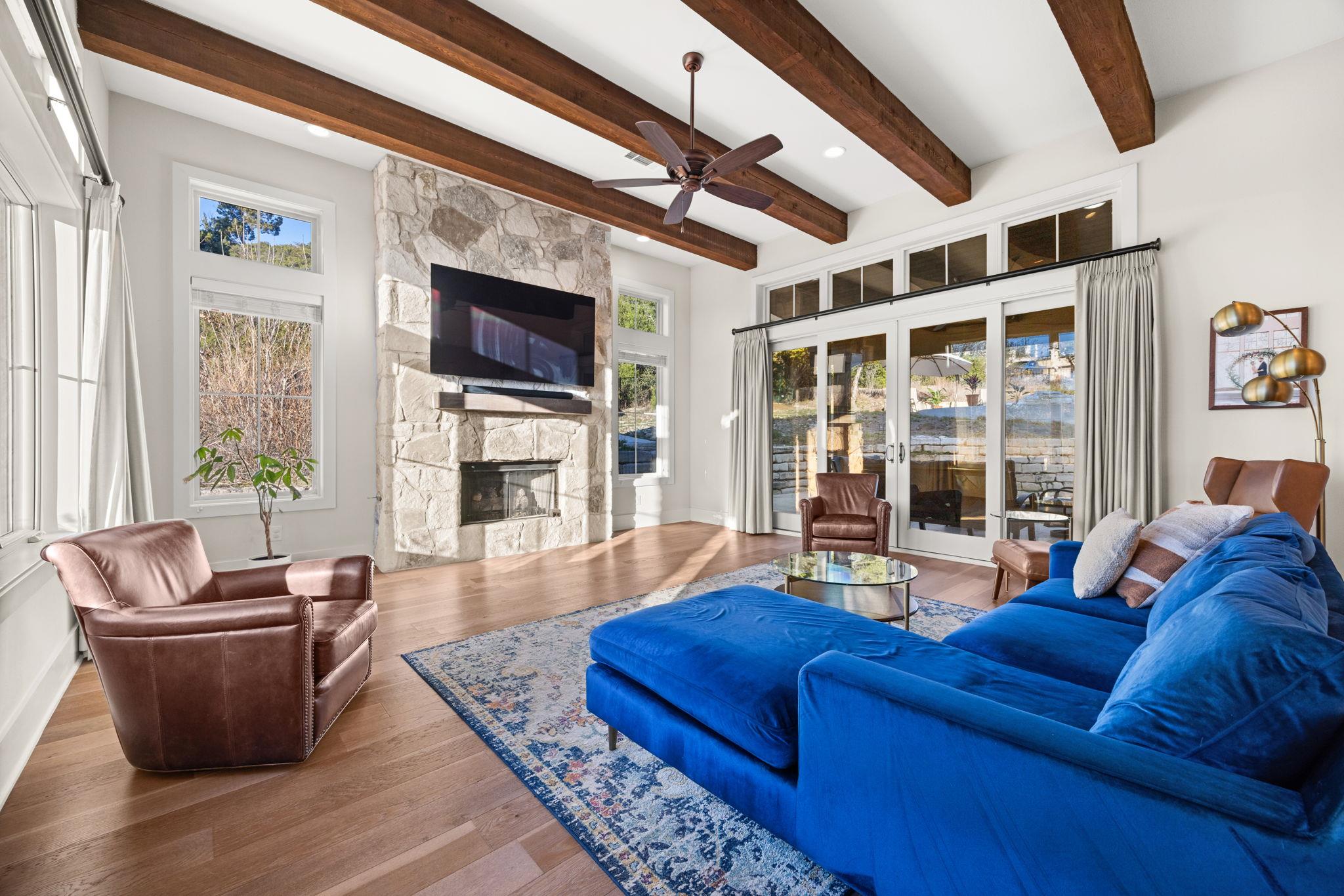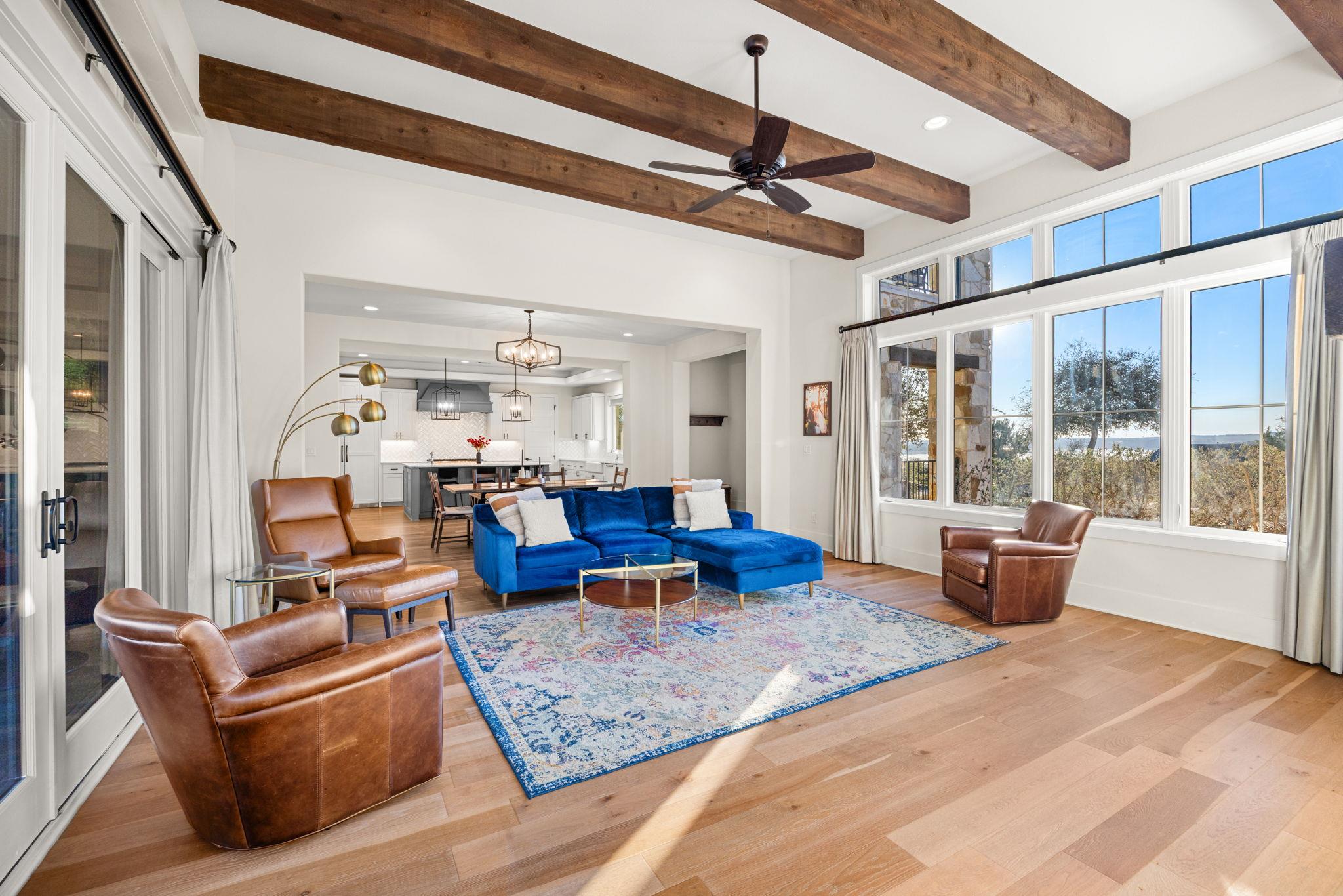 Perched on a hill at the end of a quiet cul-de-sac, 7809 Brandy Way offers breathtaking panoramic views of Lake Travis and the surrounding rolling hills and natural landscape for a truly private, peaceful setting. Situated on a spacious lot, the property features multiple outdoor entertaining areas and a large sparkling saltwater pool—perfect for enjoying the beauty of the Hill Country. Offering over 3,500 sq ft of thoughtfully designed living space, this home features 4 bedrooms (2 up, 2 down) and 4.5 baths. Inside, soaring ceilings, expansive windows, and an open-concept layout flood the home with natural light while framing the breathtaking views. High-end finishes and appliances, a cozy gas fireplace, and a versatile floor plan create an ideal setting for both everyday living and entertaining. An upstairs balcony provides the perfect place to unwind and take in the scenery. Enjoy the freedom of no HOA and a welcoming community atmosphere. Conveniently located near Volente Beach Waterpark and a local lakeside restaurant/bar, with easy access to hiking trails and Lake Travis for boating and swimming. Thoughtful upgrades include a whole-home Aprilaire E130 dehumidifier for improved air quality and energy efficiency, an upgraded pool pump, and an 8,000-gallon rainwater collection system. Zoned to highly regarded schools and ideally situated approximately 30–35 minutes to downtown Austin and 40 minutes to the airport. A nearby fire department and Travis County Sheriff presence adds to the sense of comfort and security. A rare opportunity to own a scenic Hill Country retreat with incredible views, modern upgrades, and exceptional indoor-outdoor living.